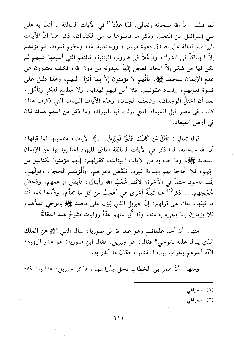 قوله تعالى: {قُلْ مَنْ كَانَ عَدُوًّا لِجِبْرِيلَ ...} الآيات، مناسبتها لما قبلها: أن الله سبحانه، لما ذكر في الآيات السالفة معاذير لليهود اعتذروا بها عن الإيمان بمحمد - صلى الله عليه وسلم -، وما جاء به من الآيات البينات، كقولهم: إنهم مؤمنون بكتابٍ من ربّهم، فلا حاجة لهم بهداية غيره، فَنَقَض دعواهم، وأَلْزمَهم الحجة، وقولَهم: إنّهم ناجون حتمًا في الآخرة؛ لأنّهم شَعْبُ الله وأبناؤُه، فأبطل مزاعمهم، ودَحضَ حُجَجهم ... ذكر (¬2) هنا تَعِلَّةً أخرى هي أعجبُ من كل ما تقدَّم، وفنَّدَها كما فنَّد ما قبلها، تلك هي قولهم: إنَّ جبريل الذي يَنِزل على محمد - صلى الله عليه وسلم - بالوحي عدوُّهم، فلا يؤمنون بما يجيء به منه، وقد أُثِر عنهم عدَّة روايات تشرحُ هذه المقالةَ: