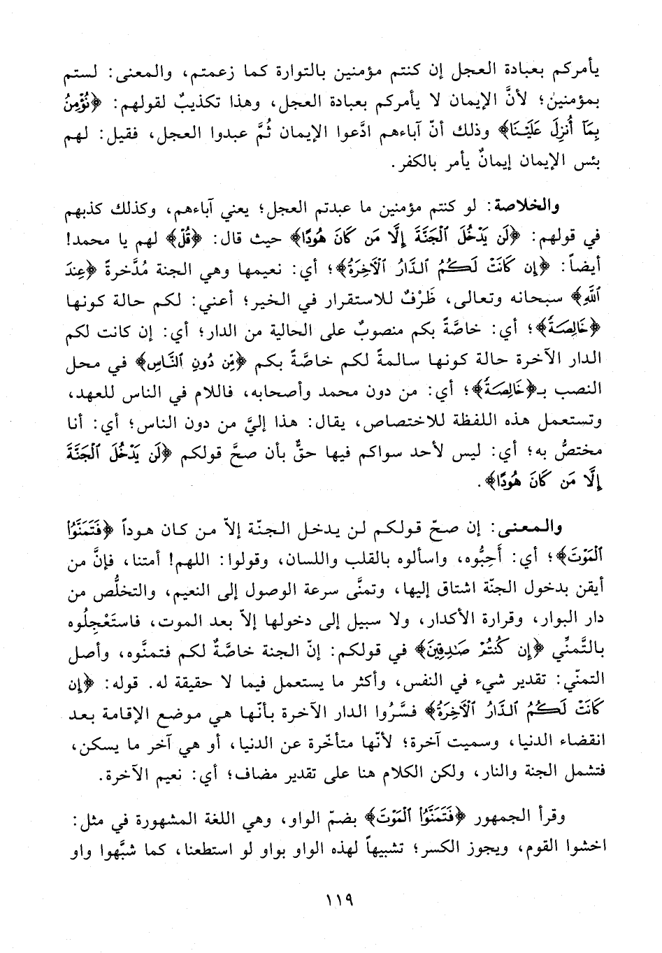 94 - {قُلْ} لهم يا محمد! أيضًا: {إِنْ كَانَتْ لَكُمُ الدَّارُ الْآخِرَةُ}؛ أي: نعيمها وهي الجنة مُدَّخرةً {عِنْدَ اللَّهِ} سبحانه وتعالى، ظَرْفٌ للاستقرار في الخير؛ أعني: لكم حالة كونها {خَالِصَةً}؛ أي: خاصَّةً بكم منصوبٌ على الحالية من الدار؛ أي: إن كانت لكم الدار الآخرة حالة كونها سالمةً لكم خاصَّةً بكم {مِنْ دُونِ النَّاسِ} في محل النصب بـ {خَالِصَةً}؛ أي: من دون محمد وأصحابه، فاللام في الناس للعهد، وتستعمل هذه اللفظة للاختصاص، يقال: هذا إليَّ من دون الناس؛ أي: أنا مختصُّ به؛ أي: ليس لأحد سواكم فيها حقٌّ بأن صحَّ قولكم {لَنْ يَدْخُلَ الْجَنَّةَ إِلَّا مَنْ كَانَ هُودًا}.