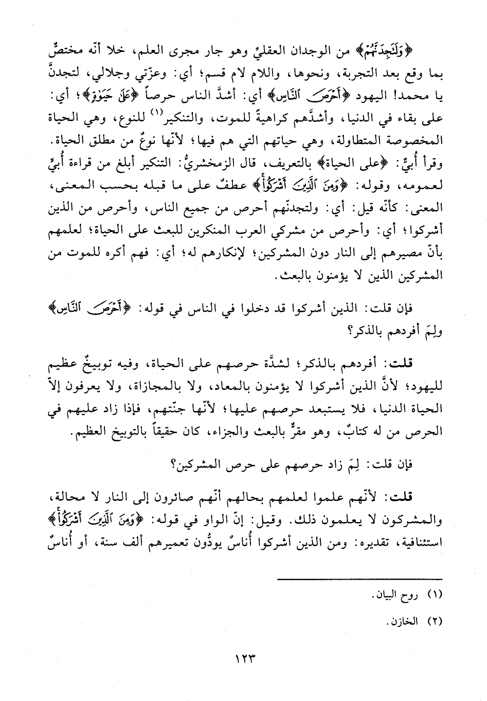 قلت: أفردهم بالذكر؛ لشدَّة حرصهم على الحياة، وفيه توبيخٌ عظيم لليهود؛ لأنَّ الذين أشركوا لا يؤمنون بالمعاد، ولا بالمجازاة، ولا يعرفون إلّا الحياة الدنيا، فلا يستبعد حرصهم عليها؛ لأنّها جنّتهم، فإذا زاد عليهم في الحرص من له كتابٌ، وهو مقرٌّ بالبعث والجزاء، كان حقيقًا بالتوبيخ العظيم.