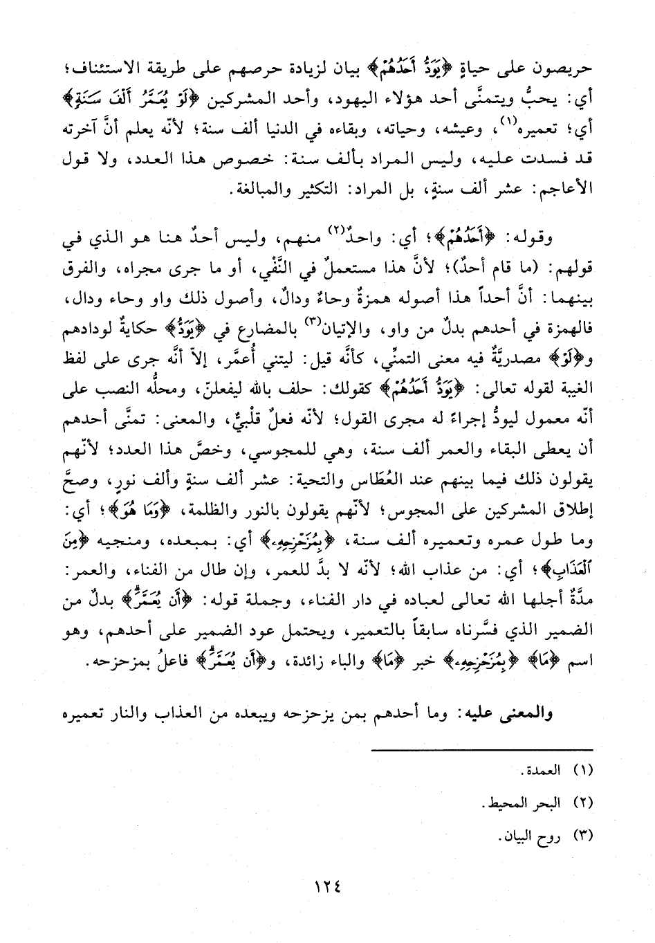 وقوله: {أَحَدُهُمْ}؛ أي: واحدٌ (¬2) منهم، وليس أحدٌ هنا هو الذي في قولهم: (ما قام أحدٌ)؛ لأنَّ هذا مستعملٌ في النَّفْي، أو ما جرى مجراه، والفرق بينهما: أنَّ أحدًا هذا أصوله همزةٌ وحاءٌ ودالٌ، وأصول ذلك واو وحاء ودال، فالهمزة في أحدهم بدلٌ من واو، والإتيان (¬3) بالمضارع في {يَوَدُّ} حكايةٌ لودادهم و {لَوْ} مصدريَّةٌ فيه معنى التمنِّي، كأنَّه قيل: ليتني أُعمَّر، إلّا أنَّه جرى على لفظ الغيبة لقوله تعالى: {يَوَدُّ أَحَدُهُمْ} كقولك: حلف بالله ليفعلنّ، ومحلُّه النصب على أنه معمول ليودُّ إجراءً له مجرى القول؛ لأنّه فعلٌ قلْبيٌّ، والمعنى: تمنَّى أحدهم أن يعطى البقاء والعمر ألف سنة، وهي للمجوسي، وخصَّ هذا العدد؛ لأنّهم يقولون ذلك فيما بينهم عند العُطَاس والتحية: عشر ألف سنةٍ وألف نورٍ، وصحَّ إطلاق المشركين على المجوس؛ لأنّهم يقولون بالنور والظلمة، {وَمَا هُوَ}؛ أي: وما طول عمره وتعميره ألف سنة، {بِمُزَحْزِحِهِ} أي: بمبعده، ومنجيه {مِنَ الْعَذَابِ}؛ أي: من عذاب الله؛ لأنّه لا بدَّ للعمر، وإن طال من الفناء، والعمر: مدَّةٌ أجلها الله تعالى لعباده في دار الفناء، وجملة قوله: {أَنْ يُعَمَّرَ} بدلٌ من الضمير الذي فسَّرناه سابقًا بالتعمير، ويحتمل عود الضمير على أحدهم، وهو اسم {مَا} {بِمُزَحْزِحِهِ} خبر {مَا} والباء زائدة، و {أنْ يُعَمَّرَ} فاعلُ بمزحزحه.