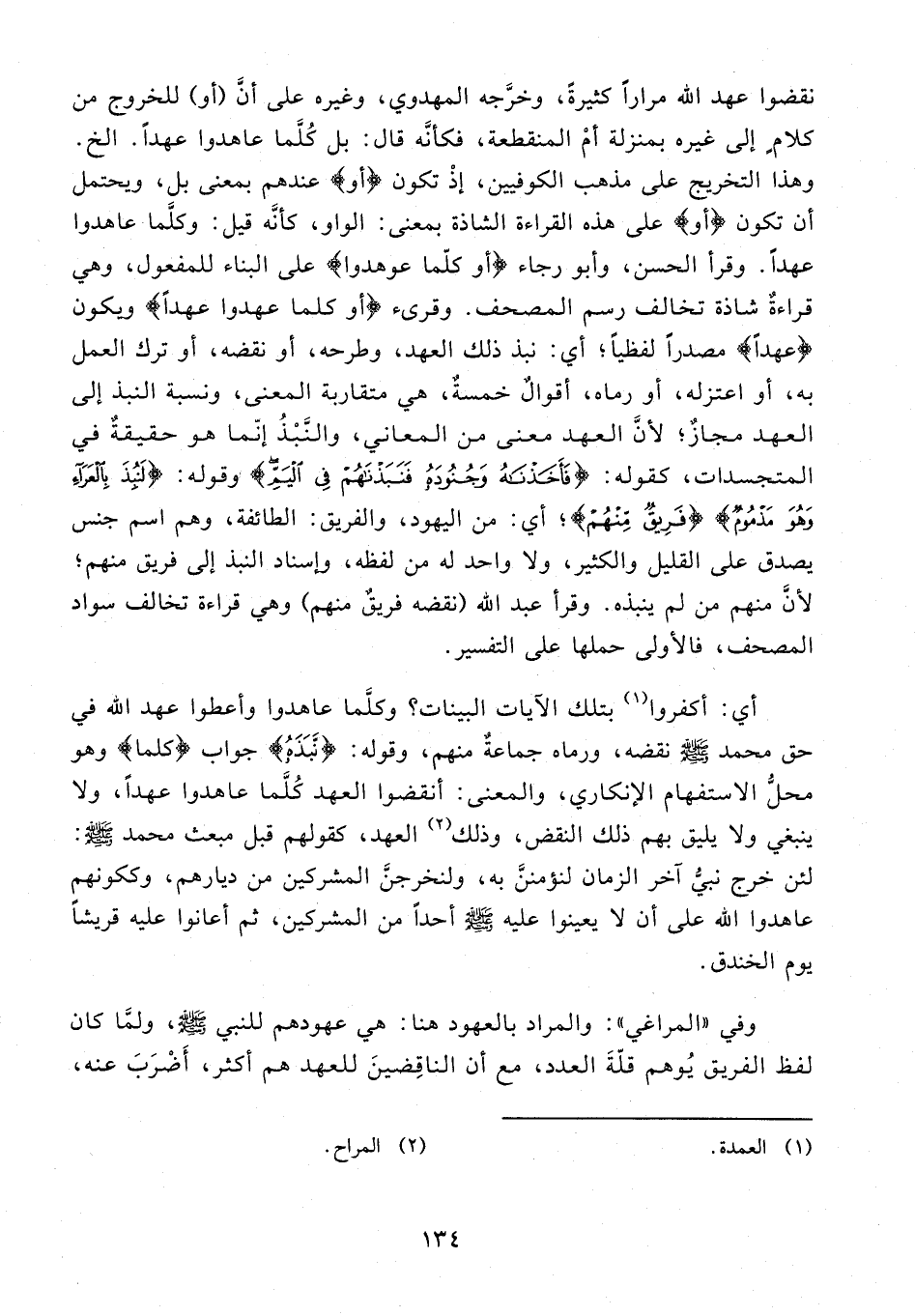 وفي "المراغي": والمراد بالعهود هنا: هي عهودهم للنبي - صلى الله عليه وسلم -، ولمَّا كان لفظ الفريق يُوهم قلّةَ العدد، مع أن الناقِضينَ للعهد هم أكثر، أَضْرَبَ عنه،