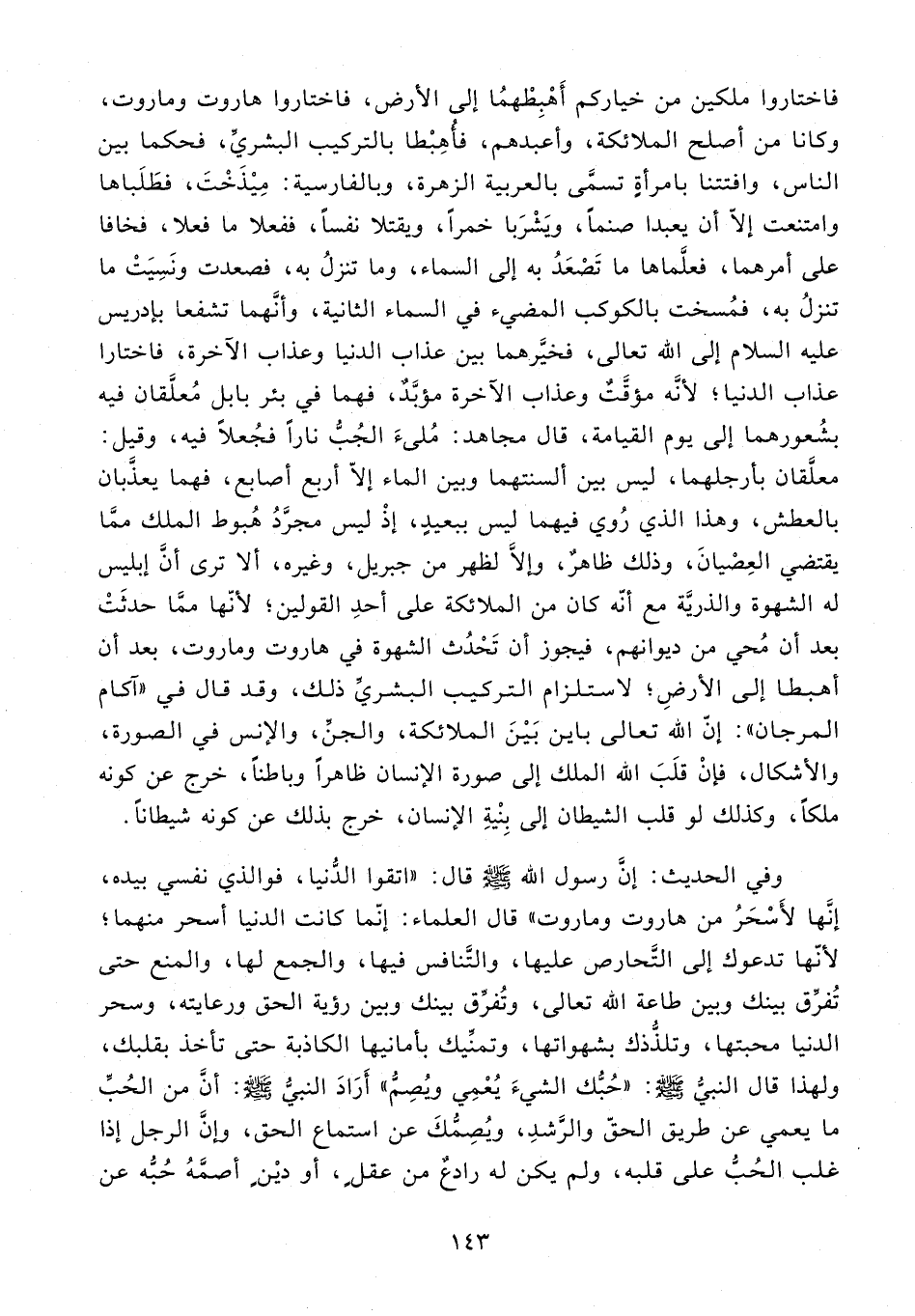 وفي الحديث: إنَّ رسول الله - صلى الله عليه وسلم - قال: "اتقوا الدُّنيا، فوالذي نفسي بيده، إنَّها لأَسْحَرُ من هاروت وماروت" قال العلماء: إنّما كانت الدنيا أسحر منهما؛ لأنّها تدعوك إلى التَّحارص عليها، والتَّنافس فيها، والجمع لها، والمنع حتى تُفرِّق بينك وبين طاعة الله تعالى، وتُفرِّق بينك وبين رؤية الحق ورعايته، وسحر الدنيا محبتها، وتلذُّذك بشهواتها، وتمنِّيك بأمانيها الكاذبة حتى تأخذ بقلبك، ولهذا قال النبيُّ - صلى الله عليه وسلم -: "حُبُّك الشيءَ يُعْمِي ويُصِمُّ" أَرَادَ النبيُّ - صلى الله عليه وسلم -: أنَّ من الحُبِّ ما يعمي عن طريق الحقّ والرَّشدِ، ويُصِمُّكَ عن استماع الحق، وإنَّ الرجل إذا غلب الحُبُّ على قلبه، ولم يكن له رادعٌ من عقلٍ، أو ديْنٍ أصمَّهُ حُبُّه عن