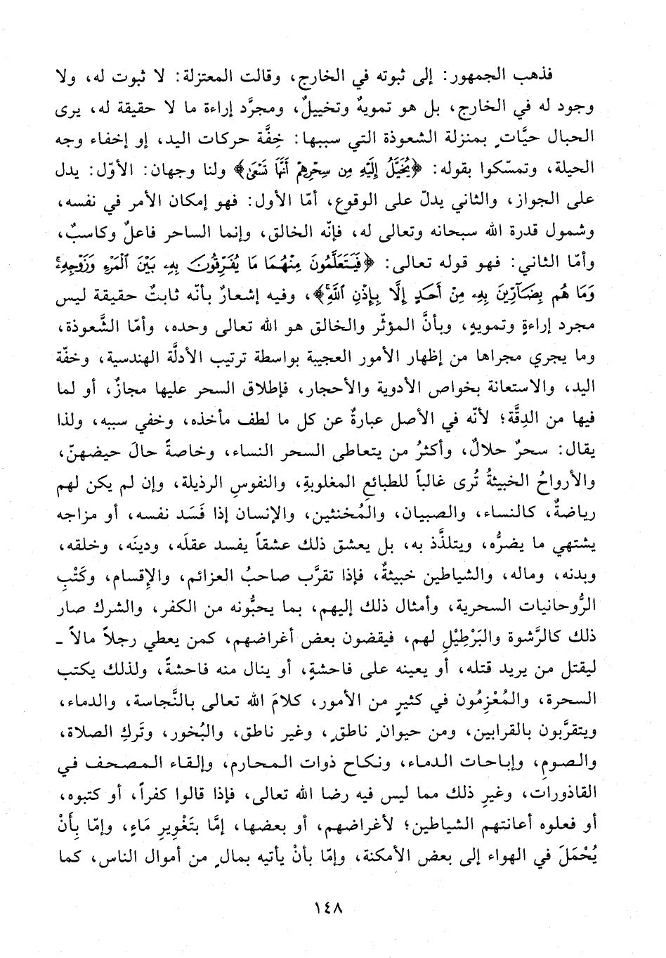 فذهب الجمهور: إلى ثبوته في الخارج، وقالت المعتزلة: لا ثبوت له، ولا وجود له في الخارج، بل هو تمويهٌ وتخييلٌ، ومجرَّد إراءة ما لا حقيقة له، يرى الحبال حيَّاتٍ بمنزلة الشعوذة التي سببها: خِفَّة حركات اليد، أو إخفاء وجه الحيلة، وتمسّكوا بقوله: {يُخَيَّلُ إِلَيْهِ مِنْ سِحْرِهِمْ أَنَّهَا تَسْعَى} ولنا وجهان: الأوّل: يدل على الجواز، والثاني يدلّ على الوقوع، أمّا الأول: فهو إمكان الأمر في نفسه، وشمول قدرة الله سبحانه وتعالى له، فإنّه الخالق، وإنما الساحر فاعلٌ وكاسبٌ، وأمّا الثاني: فهو قوله تعالى: {فَيَتَعَلَّمُونَ مِنْهُمَا مَا يُفَرِّقُونَ بِهِ بَيْنَ الْمَرْءِ وَزَوْجِهِ وَمَا هُمْ بِضَارِّينَ بِهِ مِنْ أَحَدٍ إِلَّا بِإِذْنِ اللَّهِ}، وفيه إشعارٌ بأنّه ثابتٌ حقيقة ليس مجرد إراءةٍ وتمويهٍ، وبأنَّ المؤثّر والخالق هو الله تعالى وحده، وأمّا الشَّعوذة، وما يجري مجراها من إظهار الأمور العجيبة بواسطة ترتيب الأدلَّة الهندسية، وخفّة اليد، والاستعانة بخواص الأدوية والأحجار، فإطلاق السحر عليها مجازٌ، أو لما فيها من الدِقَّة؛ لأنّه في الأصل عبارةٌ عن كل ما لطف مأخذه، وخفي سببه، ولذا يقال: سحرٌ حلالٌ، وأكثرُ من يتعاطى السحر النساء، وخاصةً حالَ حيضهنّ، والأرواحُ الخبيثةُ ترى غالبًا للطبائعِ المغلوبةِ، والنفوسِ الرذيلة، وإن لم يكن لهم رياضةٌ، كالنساء، والصبيان، والمُخنثين، والإنسان إذا فَسَد نفسه، أو مزاجه يشتهي ما يضرُّه، ويتلذَّذ به، بل يعشق ذلك عشقًا يفسد عقلَه، ودينَه، وخلقه، وبدنه، وماله، والشياطين خبيثةٌ، فإذا تقرَّب صاحبُ العزائم، والإِقسام، وكَتْبِ الرُّوحانيات السحرية، وأمثال ذلك إليهم، بما يحبُّونه من الكفر، والشرك صار ذلك كالرَّشوة والبَرْطِيْلِ لهم، فيقضون بعض أغراضهم، كمن يعطي رجلًا مالًا - ليقتل من يريد قتله، أو يعينه على فاحشةٍ، أو ينال منه فاحشةً، ولذلك يكتب السحرة، والمُعْزِمُون في كثيرٍ من الأمور، كلامَ الله تعالى بالنَّجاسة، والدماء، ويتقرَّبون بالقرابين، ومن حيوانٍ ناطقٍ، وغير ناطق، والبُخور، وتَركِ الصلاة، والصومِ، وإباحات الدماء، ونكاح ذوات المحارم، وإلقاء المصحف في القاذورات، وغيرِ ذلك مما ليس فيه رضا الله تعالى، فإذا قالوا كفرًا، أو كتبوه، أو فعلوه أعانتهم الشياطين؛ لأغراضهم، أو بعضها، إمَّا بتَغْوِيرِ مَاءٍ، وإمّا بِأَنْ يُحْمَلَ في الهواء إلى بعض الأمكنة، وإمّا بأنْ يأتيه بمالٍ من أموال الناس، كما