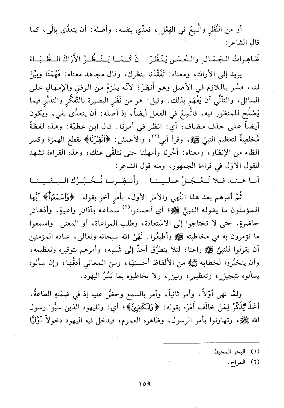 يريد إلى الأراك، ومعناه: تَفَقَّدْنا بنظرك، وقال مجاهد معناه: فَهِّمْنَا وبيِّنْ لنا، فسَّر باللازم في الأصل وهو أَنظِرَ؛ لأنّه يلزمُ من الرفقِ والإمهالِ على السائل، والتأنِّي أن يَفْهَم بذلك. وقيل: هو من نَظَرِ البصيرة بالتَّفكُّرِ والتدبُّرِ فيما يَصْلُح للمنظور فيه، فاتُّسِعَ في الفعل أيضًا، إذ أصله: أن يتعدَّى بفي، ويكون أيضًا على حذف مضاف؛ أي: انظر في أمرنا. قال ابن عطيّة: وهذه لفظةٌ مُخلصةٌ لتعظيم النبيِّ - صلى الله عليه وسلم -، وقرأ أبي (¬1)، والأعمش: {أنْظِرْنَا} بقطع الهمزة وكسر الظاء من الإنظار، ومعناه: أخِّرنا وأمهلنا حتى نتلقَّى عنك، وهذه القراءة تشهد للقول الأوّل في قراءة الجمهور، ومنه قول الشاعر: