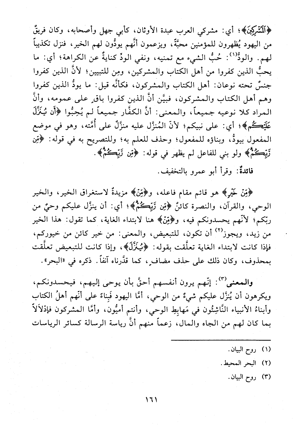 {الْمُشْرِكِينَ}؛ أي: مشركي العرب عبدة الأوثان، كأبي جهل وأصحابه، وكان فريقٌ من اليهود يُظهرون للمؤمنين محبَّةً، ويزعمون أنَّهم يودُّون لهم الخير، فنزل تكذيبًا لهم. والودُّ (¬1): حُبُّ الشيء مع تمنيه، ونفي الودِّ كنايةٌ عن الكراهة؛ أي: ما يحبُّ الذين كفروا من أهل الكتاب والمشركين، ومِن للتبيين؛ لأنَّ الذين كفروا جنسٌ تحته نوعان: أهل الكتاب والمشركون، فكأنَّه قيل: ما يودُّ الذين كفروا وهم أهل الكتاب والمشركون، فبيَّن أنَّ الذين كفروا باقٍ على عمومه، وأنَّ المراد كلا نوعيه جميعًا، والمعنى: أنَّ الكفار جميعًا لم يُحِبُّوا {أَنْ يُنَزَّلَ عَلَيْكُمْ}؛ أي: على نبيكم؛ لأنّ المُنزَّل عليه منزَّلٌ على أُمَّته، وهو في موضع المفعول بيودُّ، وبناؤه للمفعول؛ وحذف للعلم به؛ وللتصريح به في قوله: {مِنْ رَبِّكُمْ} ولو بني للفاعل لم يظهر في قوله: {مِنْ رَبِّكُمْ}.
