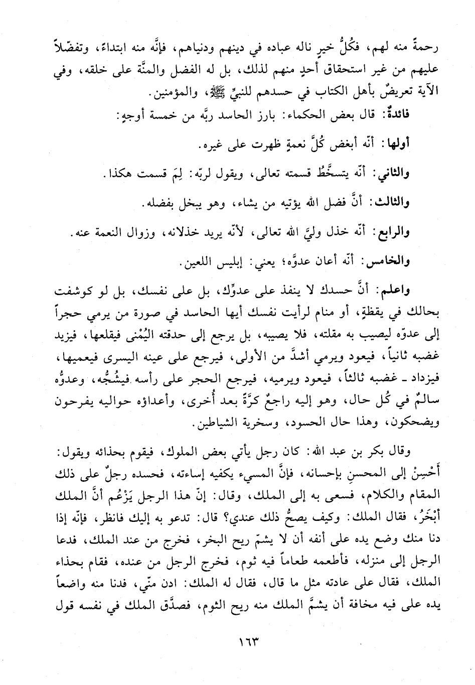 فائدةٌ: قال بعض الحكماء: بارز الحاسد ربَّه من خمسة أوجهٍ: