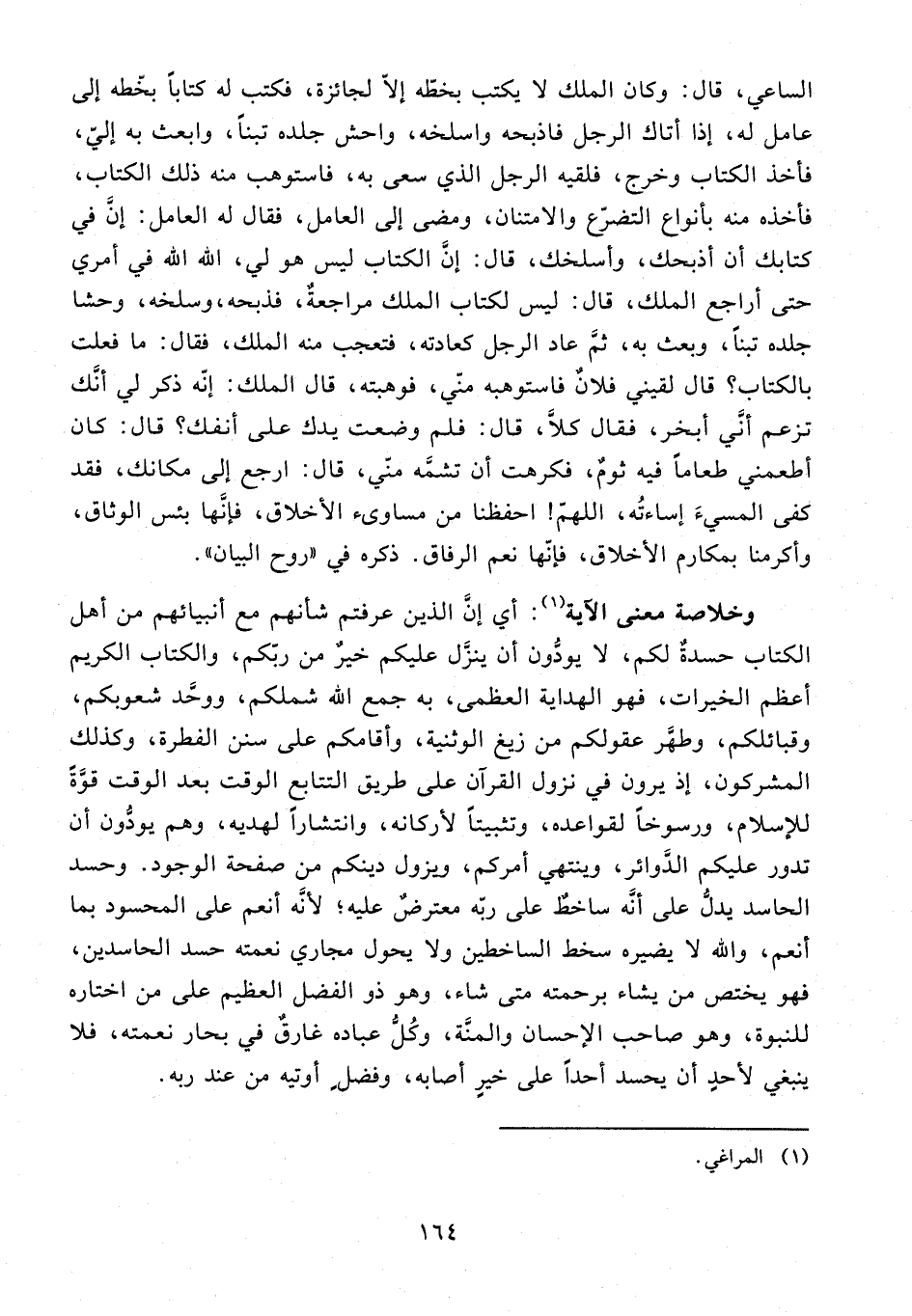 الساعي، قال: وكان الملك لا يكتب بخطّه إلّا لجائزة، فكتب له كتابًا بخّطه إلى عامل له، إذا أتاك الرجل فاذبحه واسلخه، واحش جلده تبنًا، وابعث به إليّ، فأخذ الكتاب وخرج، فلقيه الرجل الذي سعى به، فاستوهب منه ذلك الكتاب، فأخذه منه بأنواع التضرّع والامتنان، ومضى إلى العامل، فقال له العامل: إنَّ في كتابك أن أذبحك، وأسلخك، قال: إنَّ الكتاب ليس هو لي، الله الله في أمري حتى أراجع الملك، قال: ليس لكتاب الملك مراجعةٌ، فذبحه، وسلخه، وحشا جلده تبنًا، وبعث به، ثمَّ عاد الرجل كعادته، فتعجب منه الملك، فقال: ما فعلت بالكتاب؟ قال لقيني فلانٌ فاستوهبه منّي، فوهبته، قال الملك: إنّه ذكر لي أنَّك تزعم أنِّي أبخر، فقال كلَّا، قال: فلم وضعت يدك على أنفك؟ قال: كان أطعمني طعامًا فيه ثومٌ، فكرهت أن تشمَّه منّي، قال: ارجع إلى مكانك، فقد كفى المسيءَ إساءتُه، اللهمّ! احفظنا من مساويء الأخلاق، فإنَّها بئس الوثاق، وأكرمنا بمكارم الأخلاق، فإنّها نعم الرفاق. ذكره في "روح البيان".