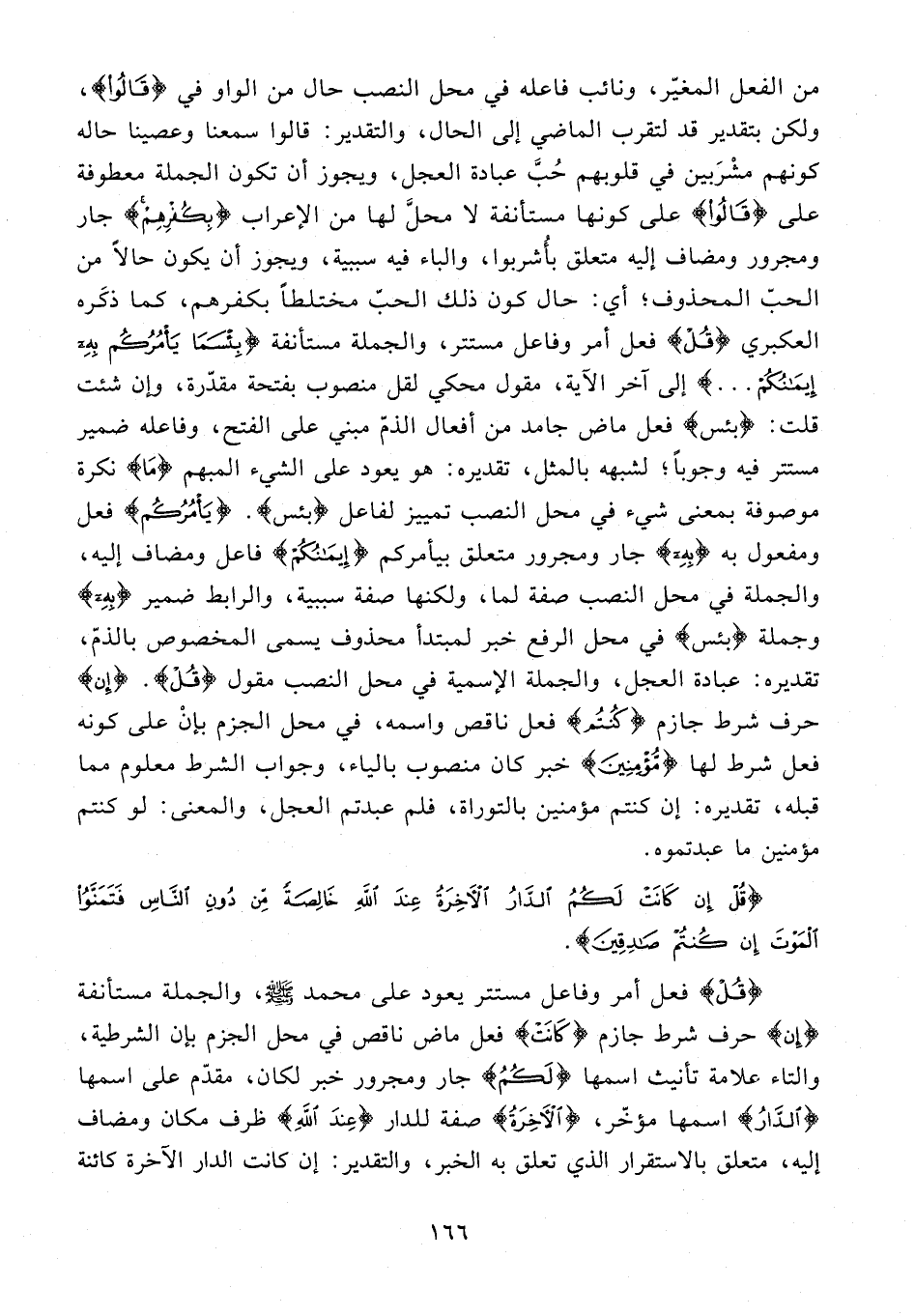 من الفعل المغيّر، ونائب فاعله في محل النصب حال من الواو في {قَالُوا}، ولكن بتقدير قد لتقرب الماضي إلى الحال، والتقدير: قالوا سمعنا وعصينا حاله كونهم مشْرَبين في قلوبهم حُبَّ عبادة العجل، ويجوز أن تكون الجملة معطوفة على {قَالُوا} على كونها مستأنفة لا محلَّ لها من الإعراب {بِكُفْرِهِمْ} جار ومجرور ومضاف إليه متعلق بأُشربوا، والباء فيه سببية، ويجوز أن يكون حالًا من الحبّ المحذوف؛ أي: حال كون ذلك الحبّ مختلطًا بكفرهم، كما ذكَره العكبري {قُلْ} فعل أمر وفاعل مستتر، والجملة مستأنفة {بِئْسَمَا يَأْمُرُكُمْ بِهِ إِيمَانُكُمْ ...} إلى آخر الآية، مقول محكي لقل منصوب بفتحة مقدّرة، وإن شئت قلت: {بئس} فعل ماض جامد من أفعال الذمّ مبني على الفتح، وفاعله ضمير مستتر فيه وجوبًا؛ لشبهه بالمثل، تقديره: هو يعود على الشيء المبهم {مَا} نكرة موصوفة بمعنى شيء في محل النصب تمييز لفاعل {بئس}. {يَأْمُرُكُمْ} فعل ومفعول به {بِهِ} جار ومجرور متعلق بيأمركم {إِيمَانُكُمْ} فاعل ومضاف إليه، والجملة في محل النصب صفة لما، ولكنها صفة سببية، والرابط ضمير {بِهِ} وجملة {بئس} في محل الرفع خبر لمبتدأ محذوف يسمى المخصوص بالذمّ، تقديره: عبادة العجل، والجملة الاسمية في محل النصب مقول {قُلْ}. {إِنْ} حرف شرط جازم {كُنْتُمْ} فعل ناقص واسمه، في محل الجزم بإنْ على كونه فعل شرط لها {مُؤْمِنِينَ} خبر كان منصوب بالياء، وجواب الشرط معلوم مما قبله، تقديره: إن كنتم مؤمنين بالتوراة، فلم عبدتم العجل، والمعنى: لو كنتم مؤمنين ما عبدتموه.