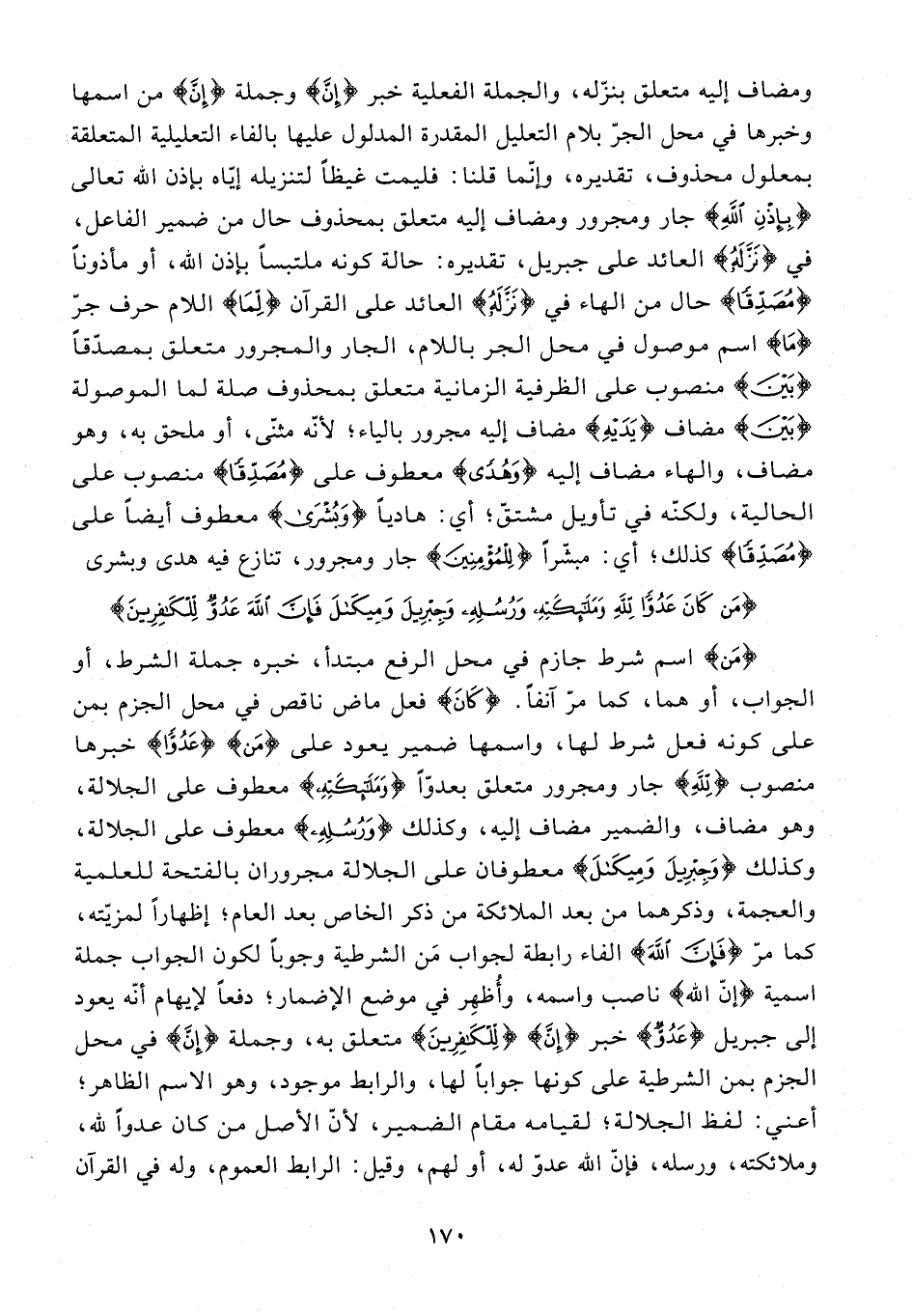 {مَنْ} اسم شرط جازم في محل الرفع مبتدأ، خبره جملة الشرط، أو الجواب، أو هما، كما مرّ آنفًا. {كاَنَ} فعل ماض ناقص في محل الجزم بمن على كونه فعل شرط لها، واسمها ضمير يعود على {مَن} {عَدُوًّا} خبرها منصوب {لِلَّهِ} جار ومجرور متعلق بعدوًّا {وَمَلَائِكَتِهِ} معطوف على الجلالة، وهو مضاف، والضمير مضاف إليه، وكذلك {وَرُسُلِهِ} معطوف على الجلالة، وكذلك {وَجِبْرِيلَ وَمِيكَالَ} معطوفان على الجلالة مجروران بالفتحة للعلمية والعجمة، وذكرهما من بعد الملائكة من ذكر الخاص بعد العام؛ إظهارًا لمزيّته، كما مرّ {فَإِنَّ اللَّهَ} الفاء رابطة لجواب مَن الشرطية وجوبًا لكون الجواب جملة اسمية {إنّ الله} ناصب واسمه، وأُظهِر في موضع الإضمار؛ دفعًا لإيهام أنّه يعود إلى جبريل {عَدُوٌّ} خبر {إِنَّ} {لِلْكَافِرِينَ} متعلق به، وجملة {إِنَّ} في محل الجزم بمن الشرطية على كونها جوابًا لها، والرابط موجود، وهو الاسم الظاهر؛ أعني: لفظ الجلالة؛ لقيامه مقام الضمير؛ لأنّ الأصل من كان عدوًّا لله، وملائكته، ورسله، فإنّ الله عدوٌّ له، أو لهم، وقيل: الرابط العموم، وله في القرآن