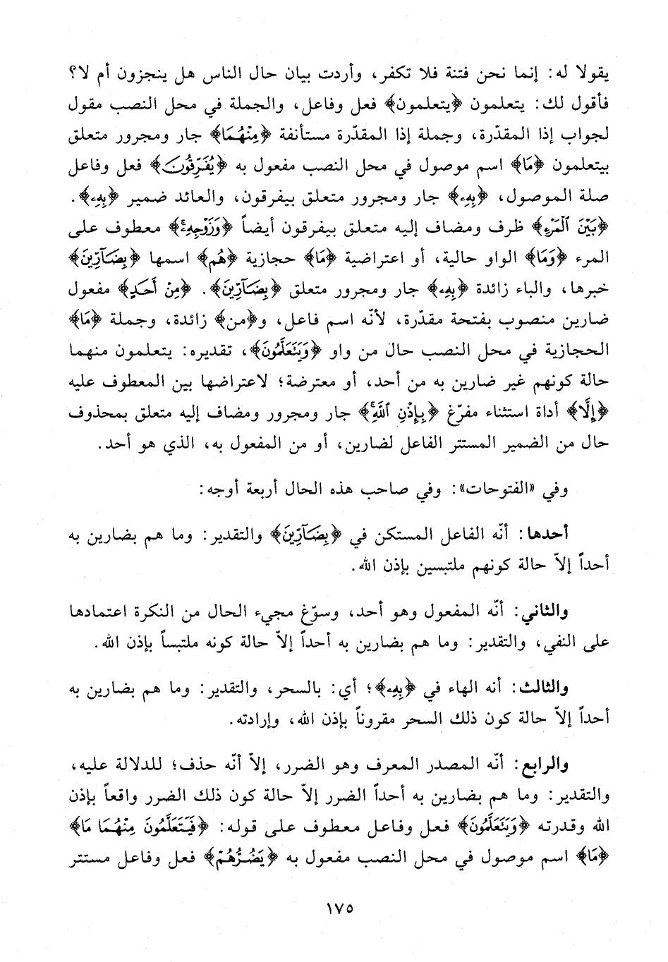 يقولا له: إنما نحن فتنة فلا تكفر، وأردت بيان حال الناس هل ينجزون أم لا؟ فأقول لك: يتعلمون {يتعلمون} فعل وفاعل، والجملة في محل النصب مقول لجواب إذا المقدّرة، وجملة إذا المقدّرة مستأنفة {مِنْهُمَا} جار ومجرور متعلق بيتعلمون {مَا} اسم موصول في محل النصب مفعول به {يُفَرِّقُونَ} فعل وفاعل صلة الموصول، {بِهِ} جار ومجرور متعلق بيفرقون، والعائد ضمير {بِهِ}. {بَيْنَ الْمَرْءِ} ظرف ومضاف إليه متعلق بيفرقون أيضًا {وَزَوْجِهِ} معطوف على المرء {وَمَا} الواو حالية، أو اعتراضية {مَا} حجازية {هُمْ} اسمها {بِضَارِّينَ} خبرها، والباء زائدة {بِهِ} جار ومجرور متعلق {بِضَارِّينَ}. {مِنْ أَحَدٍ} مفعول ضارين منصوب بفتحة مقدّرة؛ لأنّه اسم فاعل، و {من} زائدة، وجملة {مَا} الحجازية في محل النصب حال من واو {وَيَتَعَلَّمُونَ}، تقديره: يتعلمون منهما حالة كونهم غير ضارين به من أحد، أو معترضة؛ لاعتراضها بين المعطوف عليه {إلّا} أداة استثناء مفرّغ {بِإِذْنِ اللَّهِ} جار ومجرور ومضاف إليه متعلق بمحذوف حال من الضمير المستتر الفاعل لضارين، أو من المفعول به، الذي هو أحد.