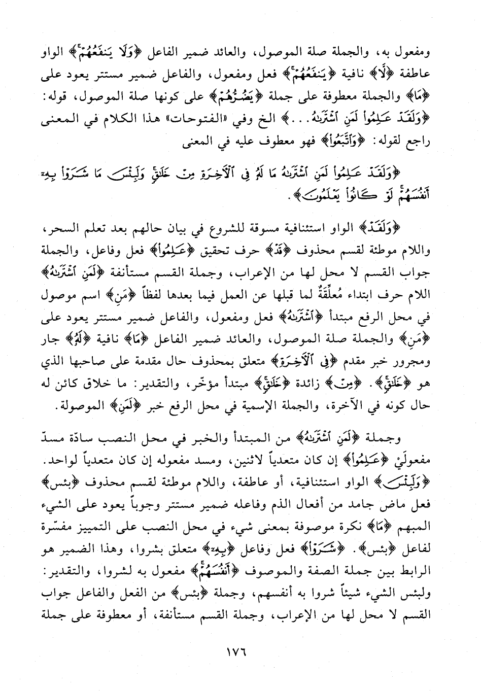 ومفعول به، والجملة صلة الموصول، والعائد ضمير الفاعل {وَلَا يَنْفَعُهُمْ} الواو عاطفة {لَا} نافية {يَنْفَعُهُمْ} فعل ومفعول، والفاعل ضمير مستتر يعود على {مَا} والجملة معطوفة على جملة {يَضُرُّهُمْ} على كونها صلة الموصول، قوله: {وَلَقَدْ عَلِمُوا لَمَنِ اشْتَرَاهُ ...} الخ وفي "الفتوحات" هذا الكلام في المعنى راجع لقوله: {وَاتَّبَعُوا} فهو معطوف عليه في المعنى.