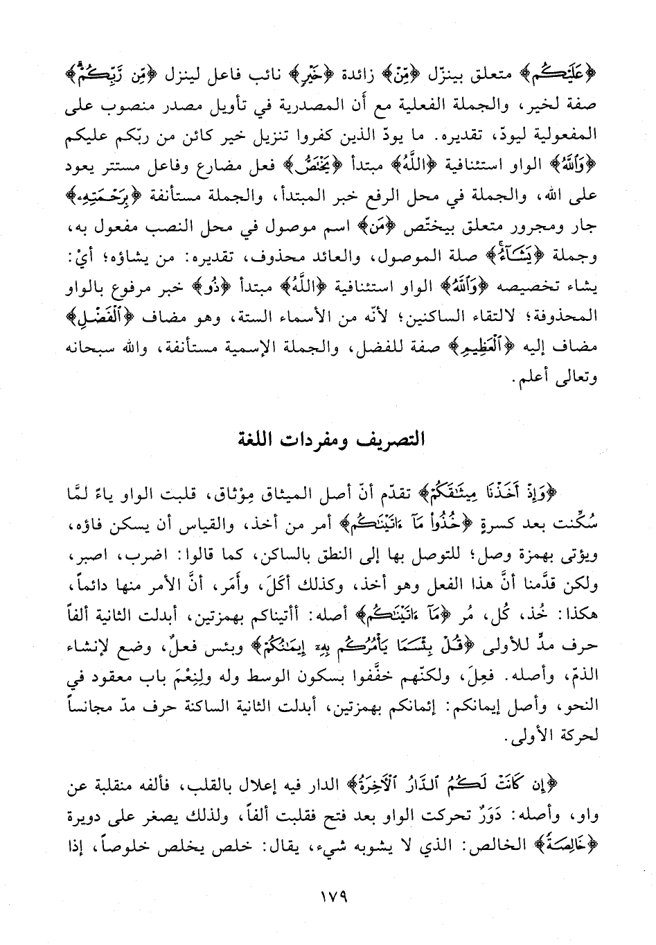 {عَلَيْكُمْ} متعلق بينزّل {مِنْ} هو زائدة {خَيْرٍ} نائب فاعل لينزل {مِنْ رَبِّكُمْ} صفة لخير، والجملة الفعلية مع أَن المصدرية في تأويل مصدر منصوب على المفعولية ليودّ، تقديره. ما يودّ الذين كفروا تنزيل خير كائن من ربّكم عليكم {وَاللَّهُ} الواو استئنافية {اللَّهُ} مبتدأ {يَخْتَصُّ} فعل مضارع وفاعل مستتر يعود على الله، والجملة في محل الرفع خبر المبتدأ، والجملة مستأنفة {بِرَحْمَتِهِ} جار ومجرور متعلق بيختّص {مَنْ} اسم موصول في محل النصب مفعول به، وجملة {يَشَاءُ} صلة الموصول، والعائد محذوف، تقديره: من يشاؤه؛ أيْ: يشاء تخصيصه {وَاللَّهُ} الواو استئنافية {اللَّهُ} مبتدأ {ذُو} خبر مرفوع بالواو المحذوفة؛ لالتقاء الساكنين؛ لأنّه من الأسماء الستة، وهو مضاف {الْفَضْلِ} مضاف إليه {الْعَظِيمِ} صفة للفضل، والجملة الاسمية مستأنفة، والله سبحانه وتعالى أعلم.
