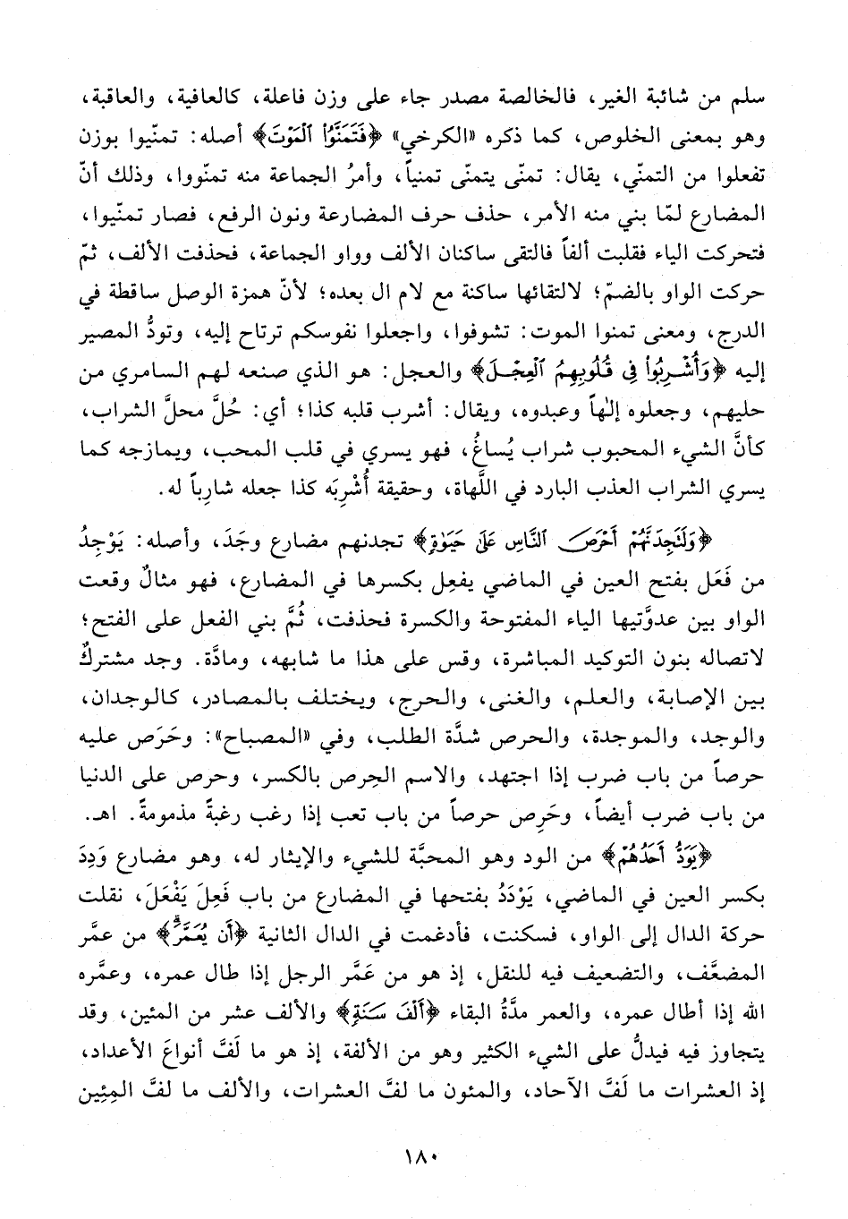 {وَلَتَجِدَنَّهُمْ أَحْرَصَ النَّاسِ عَلَى حَيَاةٍ} تجدنهم مضارع وجَدَ، وأصله: يَوْجِدُ من فَعَل بفتح العين في الماضي يفعِل بكسرها في المضارع، فهو مثالٌ وقعت الواو بين عدوَّتيها الياء المفتوحة والكسرة فحذفت، ثُمَّ بني الفعل على الفتح؛ لاتصاله بنون التوكيد المباشرة، وقس على هذا ما شابهه، ومادَّة. وجد مشتركٌ بين الإصابة، والعلم، والغنى، والحرج، ويختلف بالمصادر، كالوجدان، والوجد، والموجدة، والحرص شدَّة الطلب، وفي "المصباح": وحَرَص عليه حرصًا من باب ضرب إذا اجتهد، والاسم الحِرص بالكسر، وحرص على الدنيا من باب ضرب أيضًا، وحَرِص حرصًا من باب تعب إذا رغب رغبةً مذمومةً. اهـ.