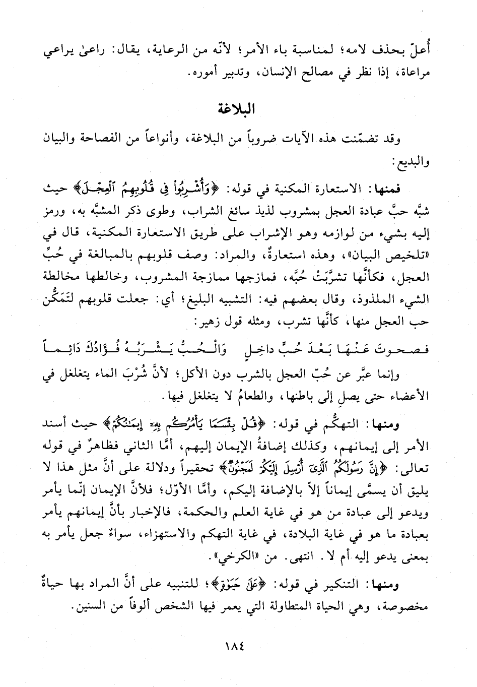 فمنها: الاستعارة المكنية في قوله: {وَأُشْرِبُوا فِي قُلُوبِهِمُ الْعِجْلَ} حيث شبَّه حبَّ عبادة العجل بمشروب لذيذ سائغ الشراب، وطوى ذكر المشبَّه به، ورمز إليه بشيء من لوازمه وهو الإشراب على طريق الاستعارة المكنية، قال في "تلخيص البيان"، وهذه استعارةٌ، والمراد: وصف قلوبهم بالمبالغة في حُبِّ العجل، فكأنَّها تشرَّبَتْ حُبَّه، فمازجها ممازجة المشروب، وخالطها مخالطة الشيء الملذوذ، وقال بعضهم فيه: التشبيه البليغ؛ أي: جعلت قلوبهم لتَمَكُّن حب العجل منها، كأنَّها تشرب، ومثله قول زهير: