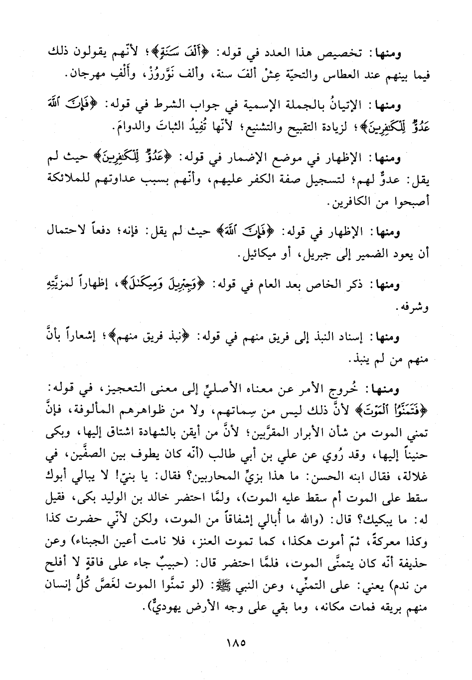 ومنها: خُروج الأمر عن معناه الأصليِّ إلى معنى التعجيز، في قوله: {فَتَمَنَّوُا الْمَوْتَ} هو لأنَّ ذلك ليس من سِماتهم، ولا من ظواهرهم المألوفة، فإنَّ تمني الموت من شأن الأبرار المقرَّبين؛ لأنَّ من أيقن بالشهادة اشتاق إليها، وبكى حنينًا إليها، وقد رُوي عن علي بن أبي طالب (أنّه كان يطوف بين الصفين، في غلالة، فقال ابنه الحسن: ما هذا بزيِّ المحاربين؟ فقال: يا بنيّ! لا يبالي أبوك سقط على الموت أم سقط عليه الموت)، ولمَّا احتضر خالد بن الوليد بكى، فقيل له: ما يبكيك؛ قال: (والله ما أُبالي إشفاقًا من الموت، ولكن لأنّي حضرت كذا وكذا معركةً، ثمّ أموت هكذا، كما تموت العنز، فلا نامت أعين الجبناء) وعن حذيفة أنّه كان يتمنَّى الموت، فلما احتضر قال: (حبيبٌ جاء على فاقةٍ لا أفلح من ندم! يعني: على التمنِّي، وعن النبي - صلى الله عليه وسلم -: (لو تمنَّوا الموت لغَصَّ كُلُّ إنسان منهم بريقه فمات مكانه، وما بقي على وجه الأرض يهوديٌّ).