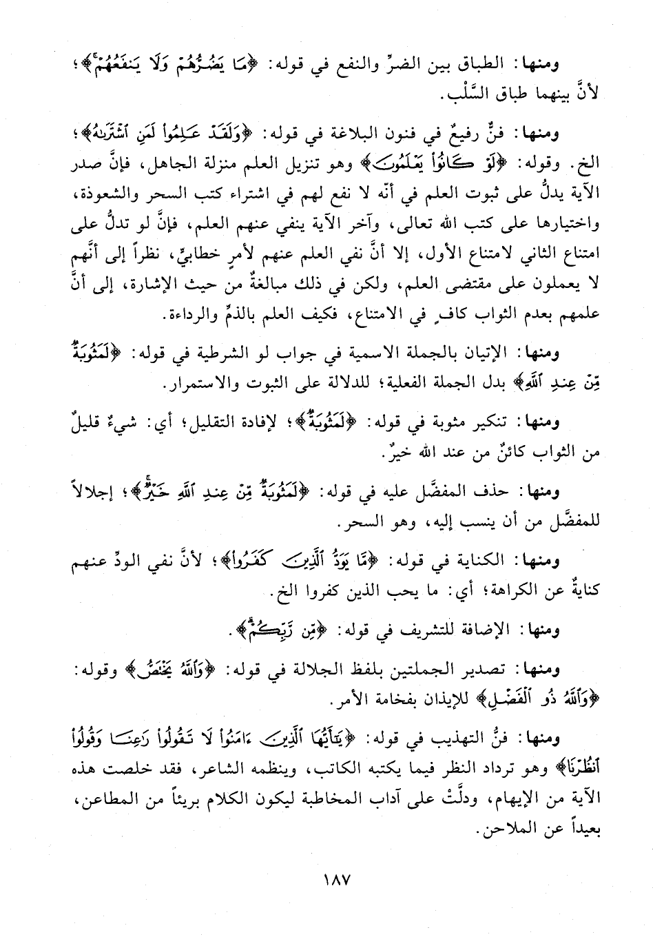 ومنها: فنٌّ رفيعٌ في فنون البلاغة في قوله: {وَلَقَدْ عَلِمُوا لَمَنِ اشْتَرَاهُ}؛ الخ. وقوله: {لَوْ كَانُوا يَعْلَمُونَ} وهو تنزيل العلم منزلة الجاهل، فإنَّ صدر الآية يدلُّ على ثبوت العلم في أنّه لا نفع لهم في اشتراء كتب السحر والشعوذة، واختيارها على كتب الله تعالى، وآخر الآية ينفي عنهم العلم، فإنَّ لو تدلُّ على امتناع الثاني لامتناع الأول، إلا أنَّ نفي العلم عنهم لأمرٍ خطابيٍّ، نظرًا إلى أنَّهم لا يعملون على مقتضى العلم، ولكن في ذلك مبالغةٌ من حيث الإشارة، إلى أنَّ علمهم بعدم الثواب كافٍ في الامتناع، فكيف العلم بالذمِّ والرداءة.