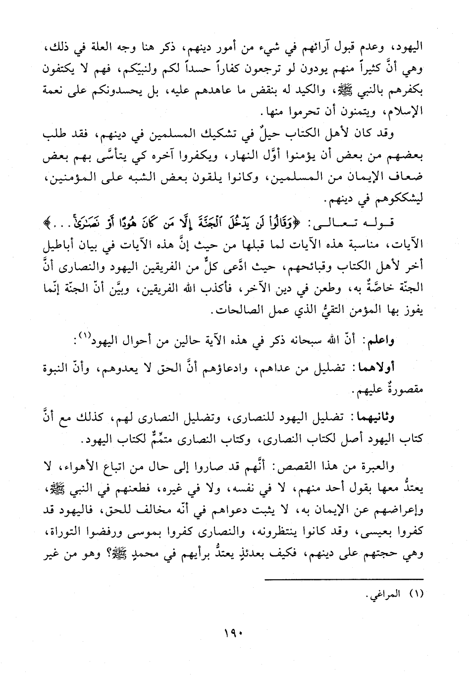 قوله تعالى: {وَقَالُوا لَنْ يَدْخُلَ الْجَنَّةَ إِلَّا مَنْ كَانَ هُودًا أَوْ نَصَارَى ...} الآيات، مناسبة هذه الآيات لما قبلها من حيث إنَّ هذه الآيات في بيان أباطيل أخر لأهل الكتاب وقبائحهم، حيث ادَّعى كلٌّ من الفريقين اليهود والنصارى أنَّ الجنّة خاصَّةٌ به، وطعن في دين الآخر، فأكذب الله الفريقين، وبيَّن أنّ الجنّة إنّما يفوز بها المؤمن التقيُّ الذي عمل الصالحات.