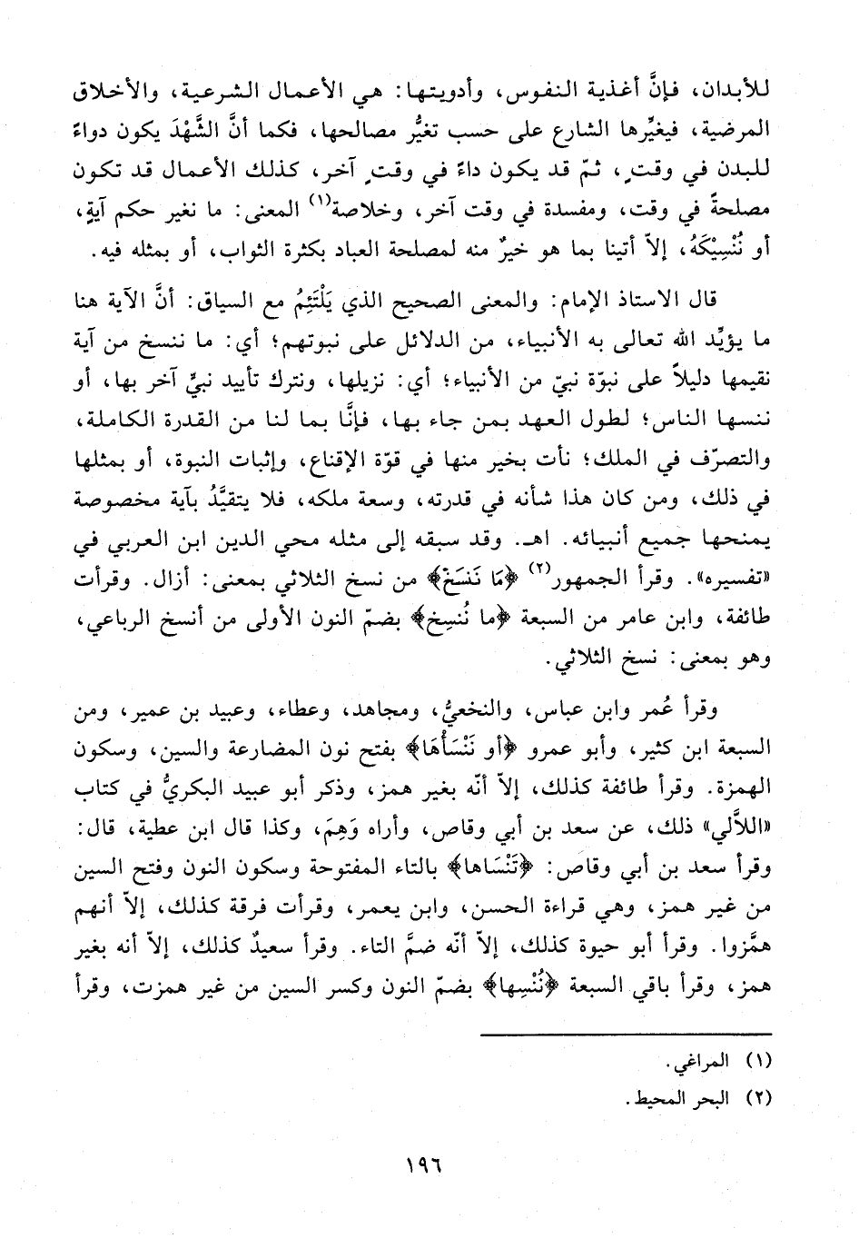 للأبدان، فإنَّ أغذية النفوس، وأدويتها: هي الأعمال الشرعية، والأخلاق المرضية، فيغيِّرها الشارع على حسب تغيُّر مصالحها، فكما أنَّ الشَّهْدَ يكون دواءً للبدن في وقتٍ، ثمّ قد يكون داءً في وقتٍ آخر، كذلك الأعمال قد تكون مصلحةً في وقت، ومفسدة في وقت آخر، وخلاصة (¬1) المعنى: ما نغير حكم آيةٍ، أو نُنْسِيْكَهُ، إلّا أتينا بما هو خيرٌ منه لمصلحة العباد بكثرة الثواب، أو بمثله فيه.