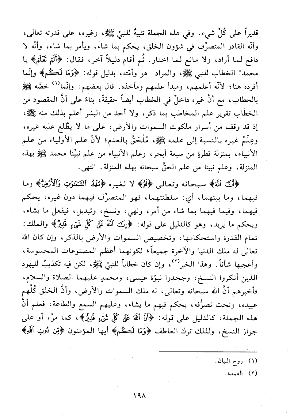 قديرًا على كُلِّ شيء. وفي هذه الجملة تنبيهٌ للنبيِّ - صلى الله عليه وسلم -، وغيره، على قدرته تعالى، وأنّه القادر المتصرِّف في شؤون الخلق، يحكم بما شاء، ويأمر بما شاء، وأنّه لا دافع لما أراد، ولا مانع لما اختار. ثُم أقام دليلًا آخر، فقال: {أَلَمْ تَعْلَمْ} يا محمد! الخطاب للنبي - صلى الله عليه وسلم -، والمراد: هو وأمّته، بدليل قوله: {وَمَا لَكُمْ} وإنّما أفرده هنا؛ لأنّه أعلمهم، ومبدأ علمهم ومأخذه. قال بعضهم: وإنّما (¬1) خصَّه - صلى الله عليه وسلم - بالخطاب، مع أنَّ غيره داخلٌ في الخطاب أيضًا حقيقةً، بناءً على أنَّ المقصود من الخطاب تقرير علم المخاطب بما ذكر، ولا أحد من البشر أعلم بذلك منه - صلى الله عليه وسلم -، إذ قد وقف من أسرار ملكوت السموات والأرض، على ما لا يطَّلع عليه غيره، وعِلْمُ غيره بالنسبة إلى علمه - صلى الله عليه وسلم -، مُلْحَقٌ بالعلم؛ لأنّ علم الأولياء من علم الأنبياء، بمنزلة قطرةٍ من سبعة أبحر، وعلم الأنبياء من علم نبيّنا محمد - صلى الله عليه وسلم - بهذه المنزلة، وعلم نبينا من علم الحقّ سبحانه بهذه المنزلة. انتهى.