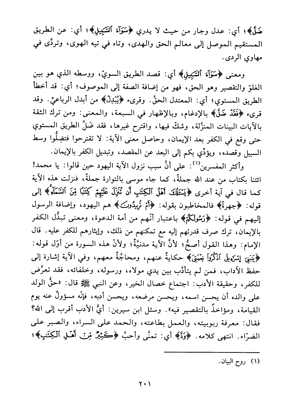 وأكثر المفسرين (¬1): على أنَّ سبب نزول الآية اليهود حين قالوا: يا محمد! ائتنا بكتاب من عند الله جملةً، كما جاء موسى بالتوارة جملةً، فنزلت هذه الآية كما قال في آية أخرى {يَسْأَلُكَ أَهْلُ الْكِتَابِ أَنْ تُنَزِّلَ عَلَيْهِمْ كِتَابًا مِنَ السَّمَاءِ} إلى قوله: {جَهْرَةً} فالمخاطبون بقوله: {أَمْ تُرِيدُونَ} هم اليهود، وإضافة الرسول إليهم في قوله: {رَسُولَكُمْ} باعتبار أنّهم من أمة الدعوة، ومعنى تبدُّل الكفر بالإيمان، ترك صرف قدرتهم إليه مع تمكنهم من ذلك، وإيثارهم للكفر عليه. قال الإِمام: وهذا القول أصحُّ؛ لأنَّ الآية مدنيَّةٌ؛ ولأنّ هذه السورة من أوّل قوله: {يَا بَنِي إِسْرَائِيلَ اذْكُرُوا نِعْمَتِيَ} حكايةٌ عنهم، ومحاجَّةٌ معهم، وفي الآية إشارة إلى حفظ الآداب، فمن لم يتأدَّب بين يدي مولاه، ورسوله، وخلفائه، فقد تعرَّض للكفر، وحقيقة الأدب: اجتماع خصال الخير، وعن النبي - صلى الله عليه وسلم - قال: "حقُّ الولد على والده أن يحسن اسمه، ويحسن مرضعه، ويحسن أدبه، فإنّه مسؤولٌ عنه يوم القيامة، ومؤاخذٌ بالتقصير فيه". وسئل ابن سيرين: أيُّ الأدب أقرب إلى الله؟ فقال: معرفة ربوبيته، والعمل بطاعته، والحمد على السراء، والصبر على الضرّاء. انتهى كلامه.