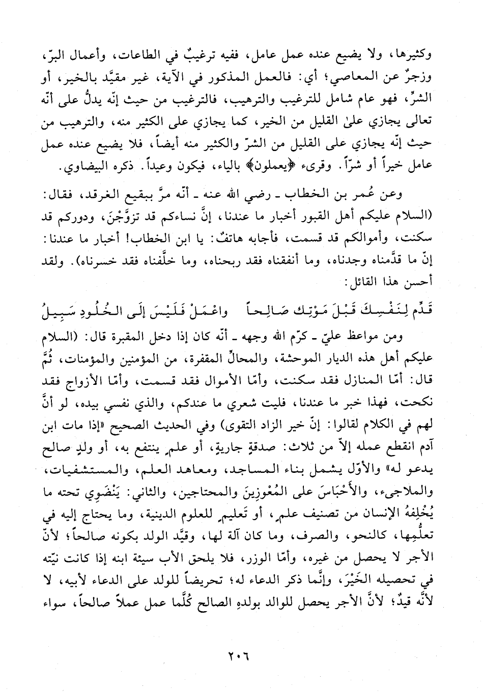 ومن مواعظ عليّ - كرّم الله وجهه - أنّه كان إذا دخل المقبرة قال: (السلام عليكم أهل هذه الديار الموحشة، والمحالِّ المقفرة، من المؤمنين والمؤمنات، ثُمَّ قال: أمّا المنازل فقد سكنت، وأمّا الأموال فقد قسمت، وأمّا الأزواج فقد نكحت، فهذا خبر ما عندنا، فليت شعري ما عندكم، والذي نفسي بيده، لو أنَّ لهم في الكلام لقالوا: إنّ خير الزاد التقوى) وفي الحديث الصحيح "إذا مات ابن آدم انقطع عمله إلّا من ثلاث: صدقةٍ جاريةٍ، أو علمٍ ينتفع به، أو ولدٍ صالح يدعو له" والأوّل يشمل بناء المساجد، ومعاهد العلم، والمستشفيات، والملاجىء، والأَحْبَاسَ على المُعْوزِينَ والمحتاجين، والثاني: يَنْضَوِي تحته ما يُخْلِفهُ الإنسان من تصنيف علمٍ، أو تَعليمٍ للعلوم الدينية، وما يحتاج إليه في تعلُّمِها، كالنحو، والصرف، وما كان آلة لها، وقيَّد الولد بكونه صالحًا؛ لأنّ الأجر لا يحصل من غيره، وأمّا الوزر، فلا يلحق الأب سيئة ابنه إذا كانت نيّته في تحصيله الخَيْرَ، وإنما ذكر الدعاء له؛ تحريضًا للولد على الدعاء لأبيه، لا لأنَه قيدٌ؛ لأنَّ الأجر يحصل للوالد بولدهِ الصالح كُلَّما عمل عملًا صالحًا، سواء
