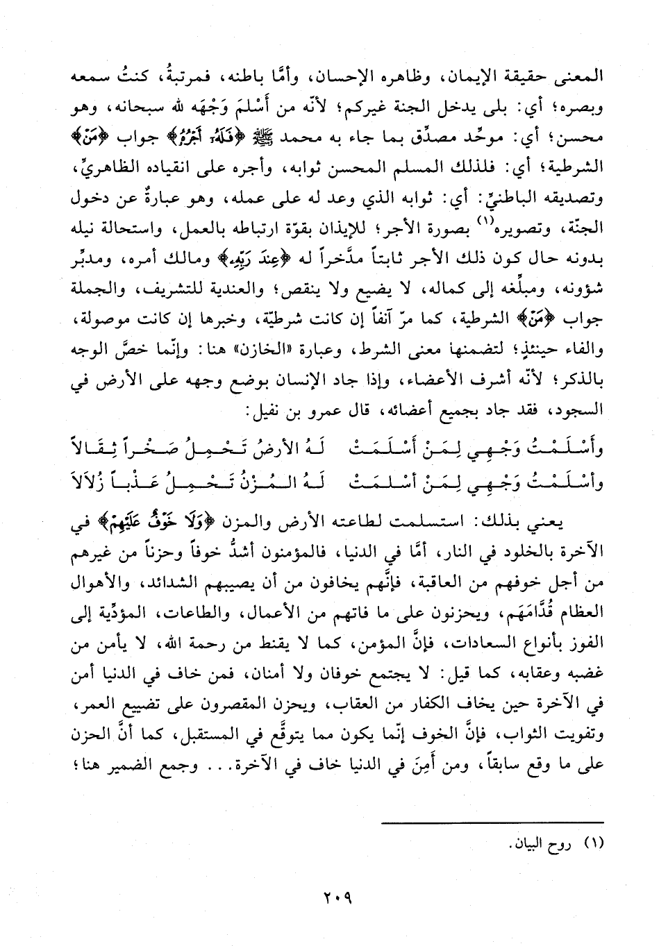 المعنى حقيقة الإيمان، وظاهره الإحسان، وأمَّا باطنه، فمرتبةُ، كنتُ سمعه وبصره؛ أي: بلى يدخل الجنة غيركم؛ لأنّه من أَسْلمَ وَجْهَه لله سبحانه، وهو محسن؛ أي: موحِّد مصدِّق بما جاء به محمد - صلى الله عليه وسلم - {فَلَهُ أَجْرُهُ} جواب {مَنْ} الشرطية؛ أي: فلذلك المسلم المحسن ثوابه، وأجره على انقياده الظاهريِّ، وتصديقه الباطنيِّ: أي: ثوابه الذي وعد له على عمله، وهو عبارةٌ عن دخول الجنّة، وتصويره (¬1) بصورة الأجر؛ للإيذان بقوّة ارتباطه بالعمل، واستحالة نيله بدونه حال كون ذلك الأجر ثابتًا مدَّخرًا له {عِنْدَ رَبِّهِ} ومالك أمره، ومدبِّر شؤونه، ومبلِّغه إلى كماله، لا يضيع ولا ينقص؛ والعندية للتشريف، والجملة جواب {مَنْ} الشرطية، كما مرّ آنفًا إن كانت شرطيّة، وخبرها إن كانت موصولة، والفاء حينئذٍ؛ لتضمن معنى الشرط، وعبارة "الخازن" هنا: وإنّما خصَّ الوجه بالذكر؛ لأنّه أشرف الأعضاء، وإذا جاد الإنسان بوضع وجهه على الأرض في السجود، فقد جاد بجميع أعضائه، قال عمرو بن نفيل: