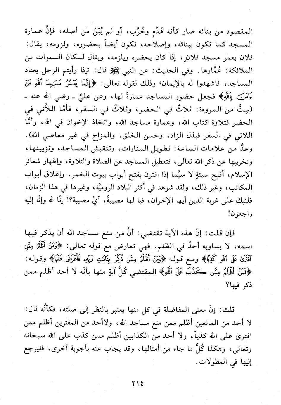 المقصود من بنائه صار كأنه هُدِّم وخُرِّب، أو لم يُبْنَ من أصله، فإنَّ عمارة المسجد كما تكون ببنائه، وإصلاحه، تكون أيضًا بحضوره، ولزومه، يقال: فلان يعمر مسجد فلانٍ، إذا كان يحضره ويلزمه، ويقال لسكان السموات من الملائكة: عُمَّارها. وفي الحديث: عن النبي - صلى الله عليه وسلم - قال: "إذا رأيتم الرجل يعتاد المساجد، فاشهدوا له بالإيمان" وذلك لقوله تعالى: {إِنَّمَا يَعْمُرُ مَسَاجِدَ اللَّهِ مَنْ آمَنَ بِاللَّهِ} فجعل حضور المساجد عمارةً لها، وعن عليٍّ - رضي الله عنه - (سِتٌّ من المروءة: ثلاثٌ في الحضر، وثلاثٌ في السفر، فأما اللَّاتي في الحضر فتلاوة كتاب الله، وعمارة مساجد الله، واتخاذ الإخوان في الله، وأمَّا اللاتي في السفر فبذل الزاد، وحسن الخلق، والمزاح في غير معاصي الله). وعدَّ من علامات الساعة: تطويل المنارات، وتنقيش المساجد، وتزيينها، وتخريبها عن ذكر الله تعالى، فتعطيل المساجد عن الصلاة والتلاوة، وإظهار شعائر الإِسلام، أقبح سيئةٍ لا سيَّما إذا اقترن بفتح أبواب بيوت الخمر، وإغلاق أبواب المكاتب، وغير ذلك، ولقد شوهد في أكثر البلاد الروميَّة، وغيرها في هذا الزمان، فلنبك على غربة الدين أيها الإخوان، فيا لها مصيبةً، أيَّ مصيبة؟! إنّا لله وإنّا إليه راجعون!