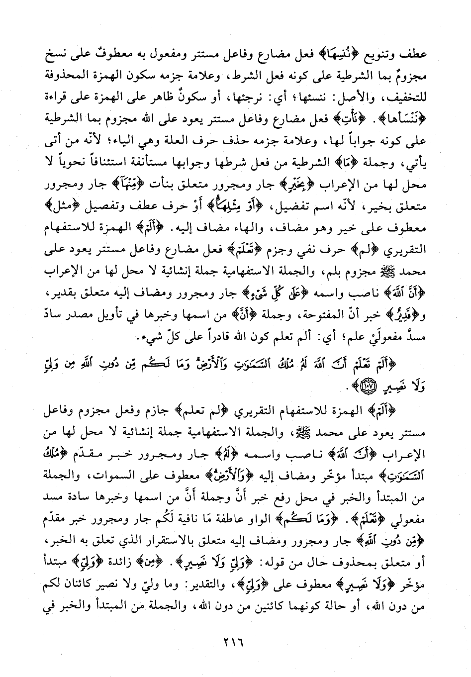 عطف وتنويع {نُنسِهَا} فعل مضارع وفاعل مستتر ومفعول به معطوفٌ على نسخ مجزومٌ بما الشرطية على كونه فعل الشرط، وعلامة جزمه سكون الهمزة المحذوفة للتخفيف، والأصل: ننسئها؛ أي: نرجئها، أو سكونٌ ظاهر على الهمزة على قراءة {نَنْسَأها}. {نَأْتِ} فعل مضارع وفاعل مستتر يعود على الله مجزوم بما الشرطية على كونه جوابًا لها، وعلامة جزمه حذف حرف العلة وهي الياء؛ لأنّه من أتى يأتي، وجملة {مَا} الشرطية من فعل شرطها وجوابها مستأنفة استئنافًا نحويًّا لا محل لها من الإعراب {بِخَيْرٍ} جار ومجرور متعلق بنأت {مِنْهَا} جار ومجرور متعلق بخير؛ لأنّه اسم تفضيل، {أَوْ مِثْلِهَا} أَوْ حرف عطف وتفصيل {مثل} معطوف على خير وهو مضاف، والهاء مضاف إليه. {أَلَمْ} الهمزة للاستفهام التقريري {لم} حرف نفي وجزم {تَعْلَمْ} فعل مضارع وفاعل مستتر يعود على محمد - صلى الله عليه وسلم - مجزوم بلم، والجملة الاستفهامية جملة إنشائية لا محل لها من الإعراب {أَنَّ اللَّهَ} ناصب واسمه {عَلَى كُلِّ شَيْءٍ} جار ومجرور ومضاف إليه متعلق بقدير، و {قَدِيرٌ} خبر أنّ المفتوحة، وجملة {أَنَّ} من اسمها وخبرها في تأويل مصدر سادّ مسدَّ مفعولَي علم؛ أي: ألم تعلم كون الله قادرًا على كلّ شيء.