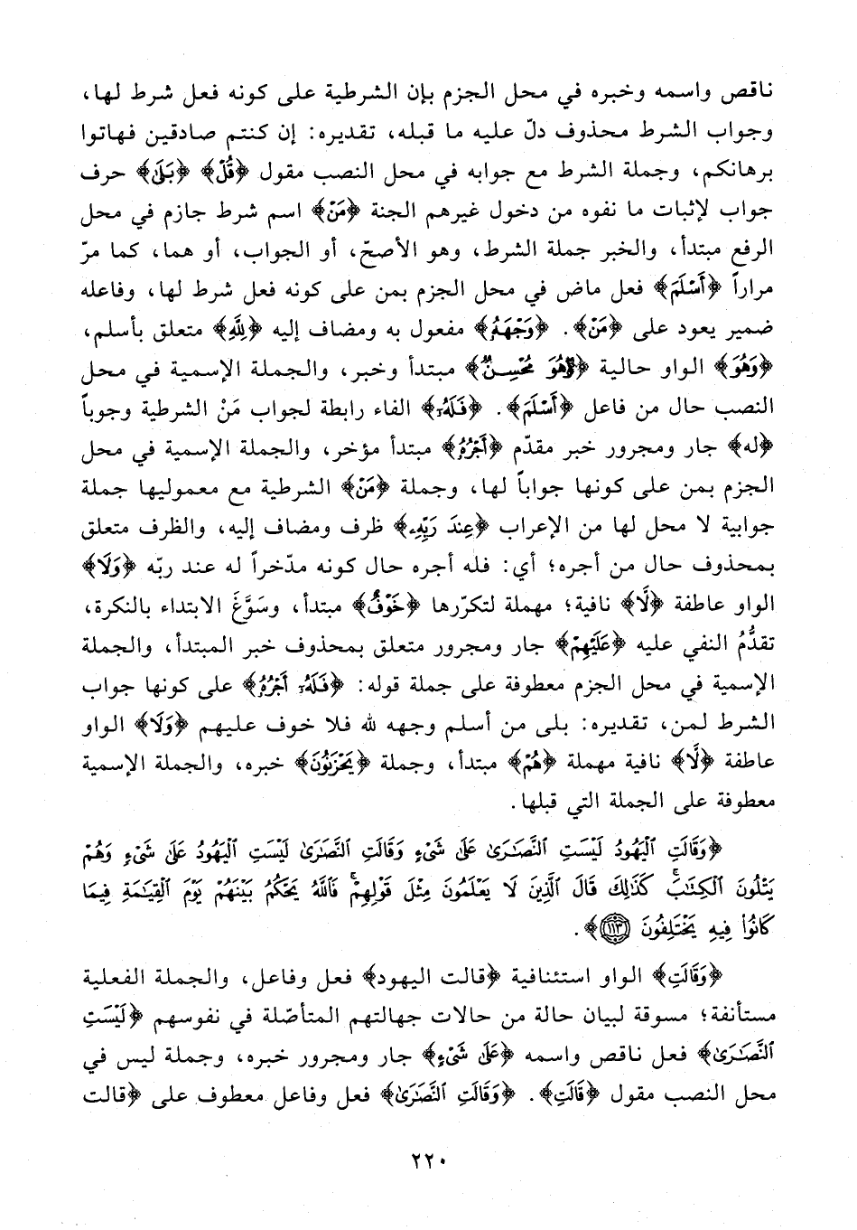 ناقص واسمه وخبره في محل الجزم بإن الشرطية على كونه فعل شرط لها، وجواب الشرط محذوف دلّ عليه ما قبله، تقديره: إن كنتم صادقين فهاتوا برهانكم، وجملة الشرط مع جوابه في محل النصب مقول {قُلْ} {بَلَى} حرف جواب لإثبات ما نفوه من دخول غيرهم الجنة {مَنْ} اسم شرط جازم في محل الرفع مبتدأ، والخبر جملة الشرط، وهو الأصحّ، أو الجواب، أو هما، كما مرّ مرارًا {أَسْلَمَ} فعل ماض في محل الجزم بمن على كونه فعل شرط لها، وفاعله ضمير يعود على {مَنْ}. {وَجْهَهُ} مفعول به ومضاف إليه {لِلَّهِ} متعلق بأسلم، {وَهُوَ} الواو حالية {وَهُوَ مُحْسِنٌ} مبتدأ وخبر، والجملة الإسمية في محل النصب حال من فاعل {أَسْلَمَ}. {فَلَهُ} الفاء رابطة لجواب مَنْ الشرطية وجوبًا {له} جار ومجرور خبر مقدّم {أَجْرُهُ} مبتدأ مؤخر، والجملة الاسمية في محل الجزم بمن على كونها جوابًا لها، وجملة {مَنْ} الشرطية مع معموليها جملة جوابية لا محل لها من الإعراب {عِنْدَ رَبِّهِ} ظرف ومضاف إليه، والظرف متعلق بمحذوف حال من أجره؛ أي: فله أجره حال كونه مدّخرًا له عند ربّه {وَلَا} الواو عاطفة {لَا} نافية؛ مهملة لتكرّرها {خَوْفٌ} مبتدأ، وسَوَّغَ الابتداء بالنكرة، تقدُّمُ النفي عليه {عَلَيْهِمْ} جار ومجرور متعلق بمحذوف خبر المبتدأ، والجملة الإسمية في محل الجزم معطوفة على جملة قوله: {فَلَهُ أَجْرُهُ} على كونها جواب الشرط لمن، تقديره: بلى من أسلم وجهه لله فلا خوف عليهم {وَلَا} الواو عاطفة {لَا} نافية مهملة {هُم} مبتدأ، وجملة {يَحْزَنُونَ} خبره، والجملة الإسمية معطوفة على الجملة التي قبلها.
