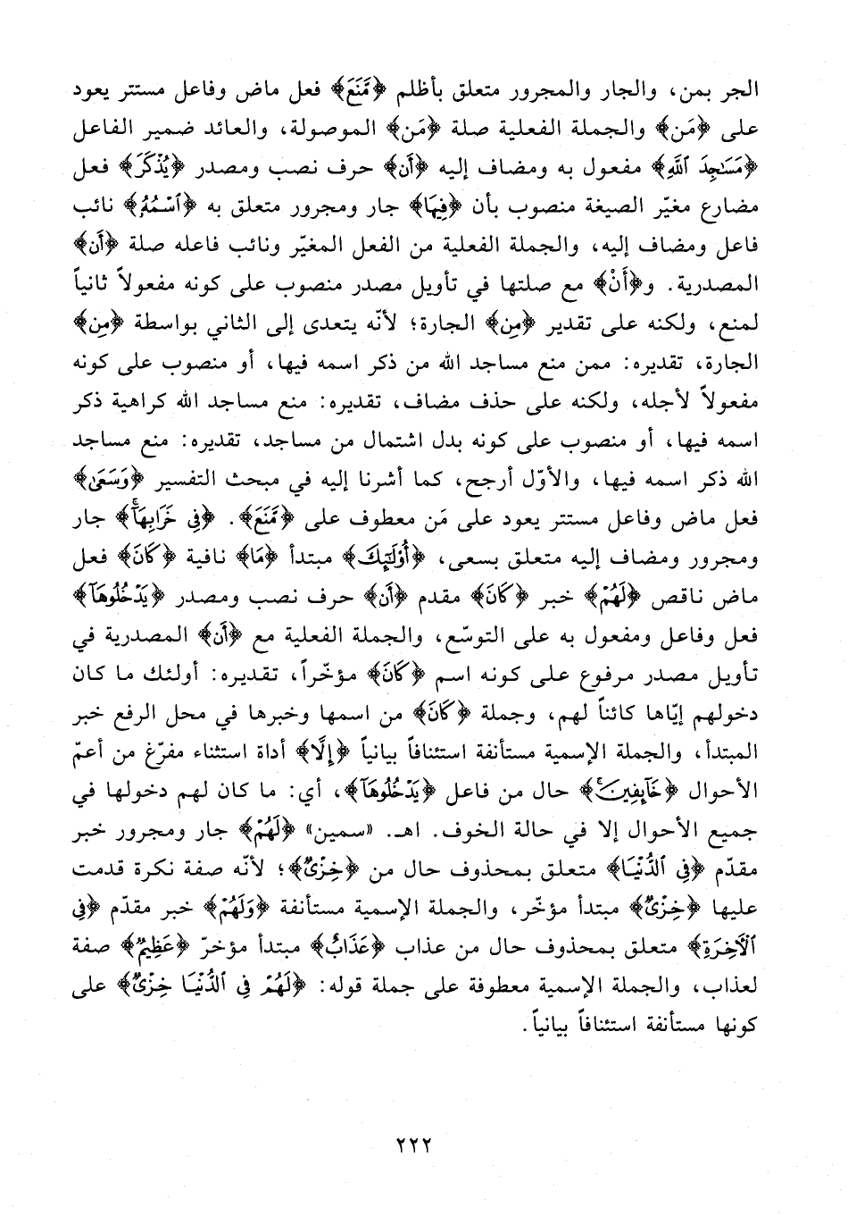 الجر بمن، والجار والمجرور متعلق بأظلم {مَنَعَ} فعل ماض وفاعل مستتر يعود على {مَن} والجملة الفعلية صلة {مَن} الموصولة، والعائد ضمير الفاعل {مَسَاجِدَ اللَّهِ} مفعول به ومضاف إليه {أَنْ} حرف نصب ومصدر {يُذْكَرَ} فعل مضارع مغيّر الصيغة منصوب بأن {فِيهَا} جار ومجرور متعلق به {اسْمُهُ} نائب فاعل ومضاف إليه، والجملة الفعلية من الفعل المغيّر ونائب فاعله صلة {أَن} المصدرية. و {أَنْ} مع صلتها في تأويل مصدر منصوب على كونه مفعولًا ثانيًا لمنع، ولكنه على تقدير {مِن} الجارة؛ لأنّه يتعدى إلى الثاني بواسطة {مِن} الجارة، تقديره: ممن منع مساجد الله من ذكر اسمه فيها، أو منصوب على كونه مفعولًا لأجله، ولكنه على حذف مضاف، تقديره: منع مساجد الله كراهية ذكر اسمه فيها، أو منصوب على كونه بدل اشتمال من مساجد، تقديره: منع مساجد الله ذكر اسمه فيها، والأوّل أرجح، كما أشرنا إليه في مبحث التفسير {وَسَعَى} فعل ماض وفاعل مستتر يعود على مَن معطوف على {مَنَعَ}. {فِي خَرَابِهَا} جار ومجرور ومضاف إليه متعلق بسعى، {أُولَئِكَ} مبتدأ {مَا} نافية {كاَنَ} فعل ماض ناقص {لَهُم} خبر {كاَنَ} مقدم {أَن} حرف نصب ومصدر {يَدْخُلُوهَا} فعل وفاعل ومفعول به على التوسّع، والجملة الفعلية مع {أَن} المصدرية في تأويل مصدر مرفوع على كونه اسم {كَانَ} مؤخّرًا، تقديره: أولئك ما كان دخولهم إيّاها كائنًا لهم، وجملة {كَانَ} من اسمها وخبرها في محل الرفع خبر المبتدأ، والجملة الإسمية مستأنفة استئنافًا بيانيًّا {إِلَّا} أداة استثناء مفرّغ من أعمّ الأحوال {خَائِفِينَ} حال من فاعل {يَدْخُلُوهَا}، أي: ما كان لهم دخولها في جميع الأحوال إلا في حالة الخوف. اهـ. "سمين" {لَهُمْ} جار ومجرور خبر مقدّم {فِي الدُّنْيَا} متعلق بمحذوف حال من {خِزْيٌ}؛ لأنّه صفة نكرة قدمت عليها {خِزْيٌ} مبتدأ مؤخّر، والجملة الإسمية مستأنفة {وَلَهُمْ} خبر مقدّم {فِي الْآخِرَةِ} متعلق بمحذوف حال من عذاب {عَذَابٌ} مبتدأ مؤخرّ {عَظِيمٌ} صفة لعذاب، والجملة الإسمية معطوفة على جملة قوله: {لَهُمْ فِي الدُّنْيَا خِزْيٌ} على كونها مستأنفة استئنافًا بيانيًّا.