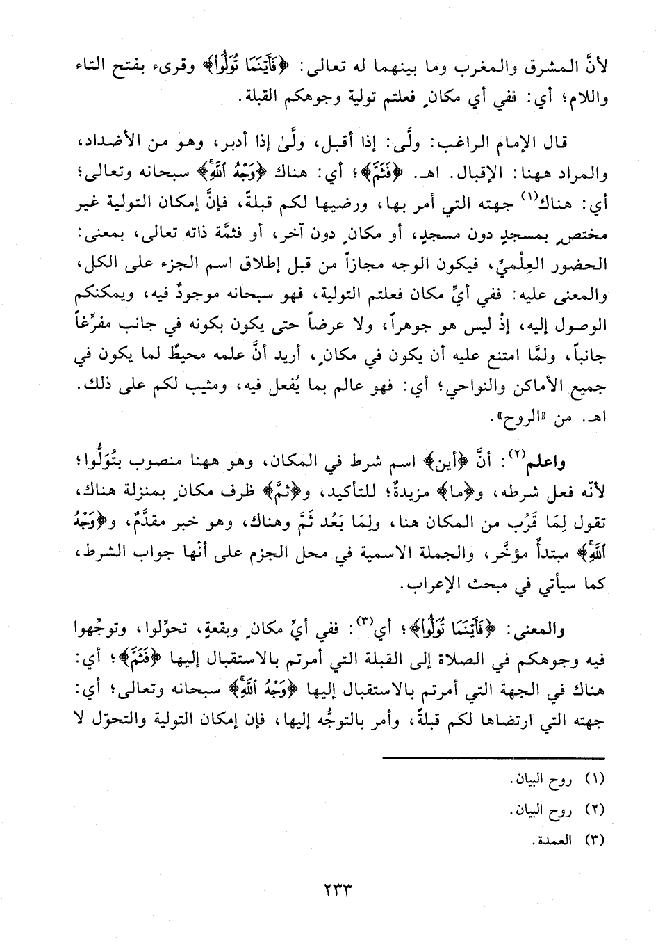 واعلم (¬2): أنَّ {أين} اسم شرط في المكان، وهو ها هنا منصوب بتُوَلُّوا؛ لأنّه فعل شرطه، و {ما} مزيدةٌ؛ للتأكيد، و {ثمَّ} ظرف مكانٍ بمنزلة هناك، تقول لِمَا قَرُب من المكان هنا، ولِمَا بَعُد ثَمَّ وهناك، وهو خبر مقدَّمٌ، و {وَجْهُ اللَّهِ} مبتدأٌ مؤخَّر، والجملة الإسمية في محل الجزم على أنّها جواب الشرط، كما سيأتي في مبحث الإعراب.