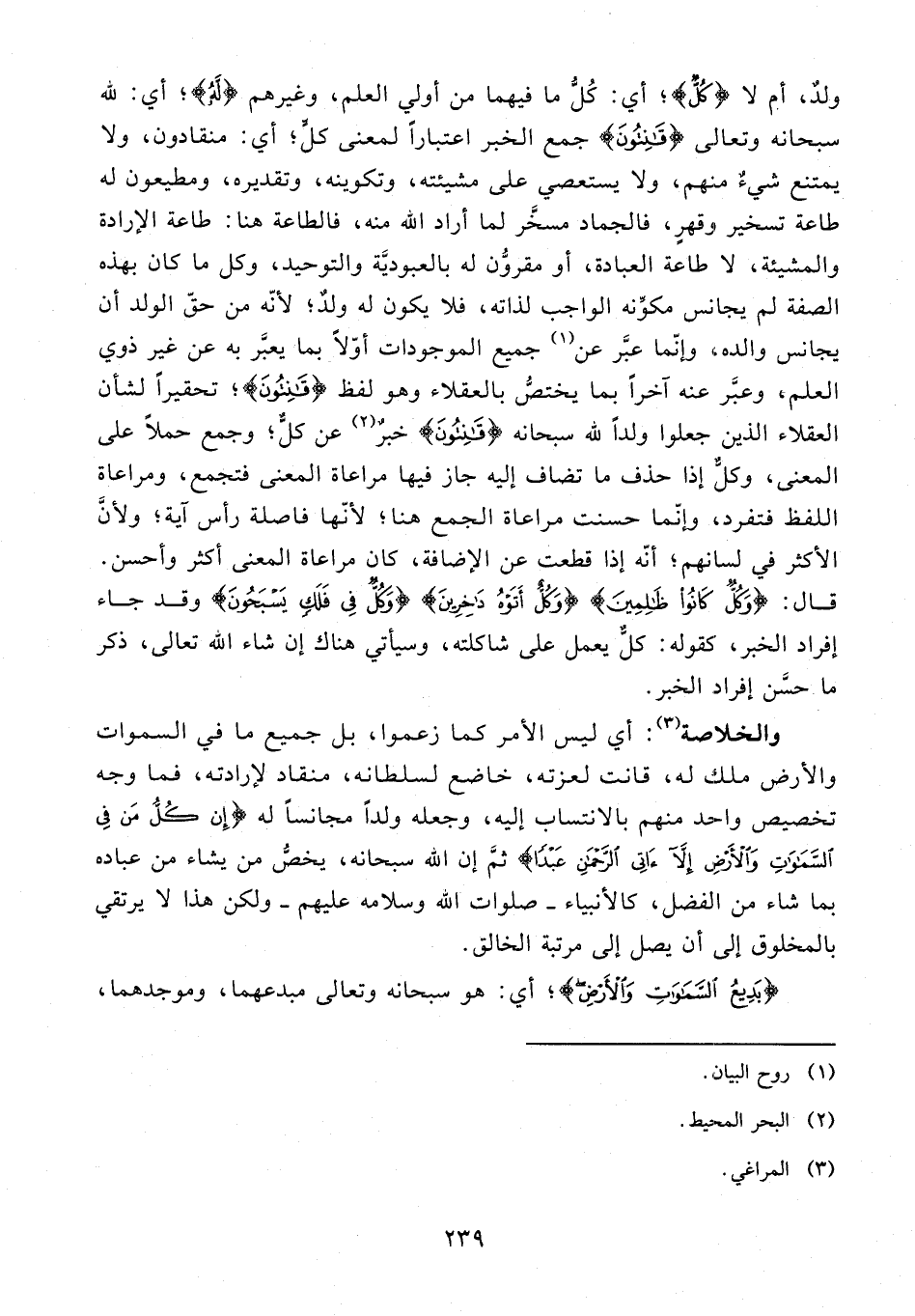 ولدٌ، أم لا {كُلٌّ}؛ أي: كُلُّ ما فيهما من أولي العلم، وغيرهم {لَهُ}؛ أي: لله سبحانه وتعالى {قَانِتُونَ} جمع الخبر اعتبارًا لمعنى كلٍّ؛ أي: منقادون، ولا يمتنع شيءٌ منهم، ولا يستعصي على مشيئته، وتكوينه، وتقديره، ومطيعون له طاعة تسخير وقهرٍ، فالجماد مسخَّر لما أراد الله منه، فالطاعة هنا: طاعة الإرادة والمشيئة، لا طاعة العبادة، أو مقروُّن له بالعبوديَّة والتوحيد، وكل ما كان بهذه الصفة لم يجانس مكوِّنه الواجب لذاته، فلا يكون له ولدٌ؛ لأنّه من حقّ الولد أن يجانس والده، وإنّما عبَّر عن (¬1) جميع الموجودات أوّلًا بما يعبَّر به عن غير ذوي العلم، وعبَّر عنه آخرًا بما يختصُّ بالعقلاء وهو لفظ {قَانِتُونَ}؛ تحقيرًا لشأن العقلاء الذين جعلوا ولدًا لله سبحانه {قَانِتُونَ} خبرٌ (¬2) عن كلٌّ؛ وجمع حملًا على المعنى، وكلٌّ إذا حذف ما تضاف إليه جاز فيها مراعاة المعنى فتجمع، ومراعاة اللفظ فتفرد، وإنّما حسنت مراعاة الجمع هنا؛ لأنّها فاصلة رأس آية؛ ولأنَّ الأكثر في لسانهم؛ أنّه إذا قطعت عن الإضافة، كان مراعاة المعنى أكثر وأحسن. قال: {وَكُلٌّ كَانُوا ظَالِمِينَ} {وَكُلٌّ أَتَوْهُ دَاخِرِينَ} {وَكُلٌّ فِي فَلَكٍ يَسْبَحُونَ} وقد جاء إفراد الخبر، كقوله: كلٌّ يعمل على شاكلته، وسيأتي هناك إن شاء الله تعالى، ذكر ما حسَّن إفراد الخبر.