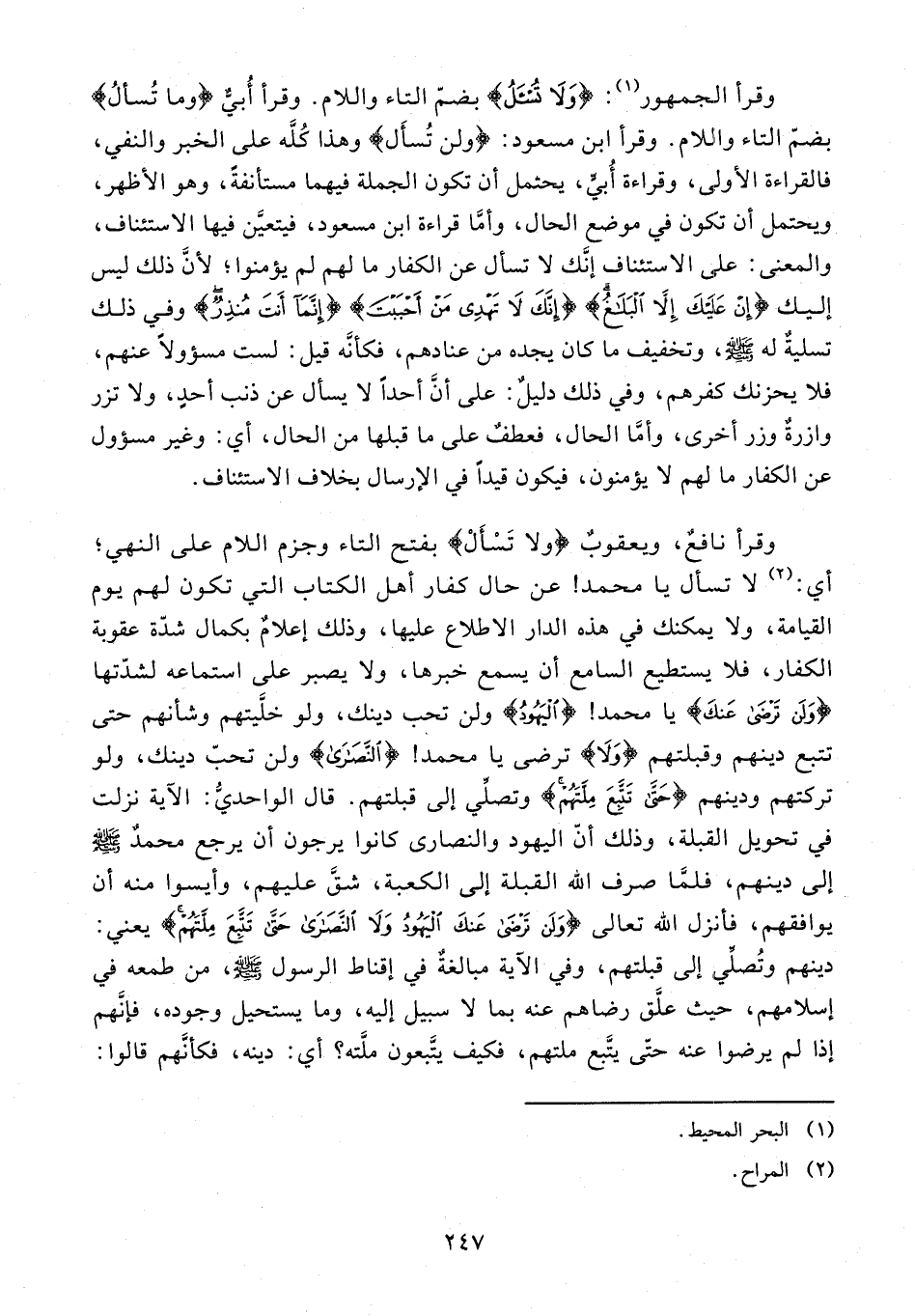 وقرأ الجمهور (¬1): {وَلَا تُسْأَلُ} بضمّ التاء واللام. وقرأ أُبيٌّ {وما تُسألُ} بضمّ التاء واللام. وقرأ ابن مسعود: {ولن تُسأَل} وهذا كُلَّه على الخبر والنفي، فالقراءة الأولى، وقراءة أُبيٍّ، يحتمل أن تكون الجملة فيهما مستأنفةً، وهو الأظهر، ويحتمل أن تَكون في موضع الحال، وأمَّا قراءة ابن مسعود، فيتعيَّن فيها الاستئناف، والمعنى: على الاستئناف إنَّك لا تسأل عن الكفار ما لهم لم يؤمنوا؛ لأنَّ ذلك ليس إليك {إِنْ عَلَيْكَ إِلَّا الْبَلَاغُ} {إِنَّكَ لَا تَهْدِي مَنْ أَحْبَبْتَ} {إِنَّمَا أَنْتَ مُنْذِرٌ} في ذلك تسليةٌ له - صلى الله عليه وسلم -، وتخفيف ما كان يجده من عنادهم، فكأنَّه قيل: لست مسؤولًا عنهم، فلا يحزنك كفرهم، وفي ذلك دليلٌ: على أنَّ أحدًا لا يسأل عن ذنب أحدٍ، ولا تزر وازرةٌ وزر أخرى، وأمَّا الحال، فعطفٌ على ما قبلها من الحال، أي: وغير مسؤول عن الكفار ما لهم لا يؤمنون، فيكون قيدًا في الإرسال بخلاف الاستئناف.
