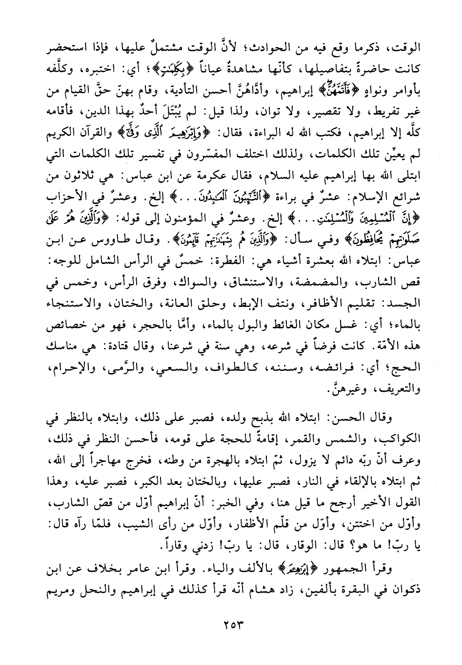 الوقت، ذكر ما، وقع فيه من الحوادث؛ لأنَّ الوقت مشتملٌ عليها، فإذا استحضر كانت حاضرةً بتفاصيلها، كأنّها مشاهدةٌ عيانًا {بِكَلِمَاتٍ}؛ أي: اختبره، وكلَّفه بأوامر ونواهٍ {فَأَتَمَّهُنَّ} إبراهيم، وأدَّاهُنَّ أحسن التأدية، وقام بهنّ حقَّ القيام من غير تفريط، ولا تقصير، ولا توان، ولذا قيل: لم يُبْتَلَ أحدٌ بهذا الدين، فأقامه كلَّه إلا إبراهيم، فكتب الله له البراءة، فقال: {وَإِبْرَاهِيمَ الَّذِي وَفَّى} والقرآن الكريم لم يعيِّن تلك الكلمات، ولذلك اختلف المفسّرون في تفسير تلك الكلمات التي ابتلى الله بها إبراهيم عليه السلام، فقال عكرمة عن ابن عباس: هي ثلاثون من شرائع الإسلام: عشرٌ في براءة {التَّائِبُونَ الْعَابِدُونَ ...} إلخ. وعشرٌ في الأحزاب {إِنَّ الْمُسْلِمِينَ وَالْمُسْلِمَاتِ ...} إلخ. وعشرٌ في المؤمنون إلى قوله: {وَالَّذِينَ هُمْ عَلَى صَلَوَاتِهِمْ يُحَافِظُونَ} وفي سأل: {وَالَّذِينَ هُمْ بِشَهَادَاتِهِمْ قَائِمُونَ}. وقال طاووس عن ابن عباس: ابتلاه الله بعشرة أشياء هي: الفطرة: خمسٌ في الرأس الشامل للوجه: قص الشارب، والمضمضة، والاستنشاق، والسواك، وفرق الرأس، وخمس في الجسد: تقليم الأظافر، ونتف الإبط، وحلق العانة، والختان، والاستنجاء بالماء؛ أي: غسل مكان الغائط والبول بالماء، وأمَّا بالحجر، فهو من خصائص هذه الأمّة. كانت فرضًا في شرعه، وهي سنة في شرعنا، وقال قتادة: هي مناسك الحج؛ أي: فرائضه، وسننه، كالطواف، والسعي، والرَّمى، والإحرام، والتعريف، وغيرهنَّ.