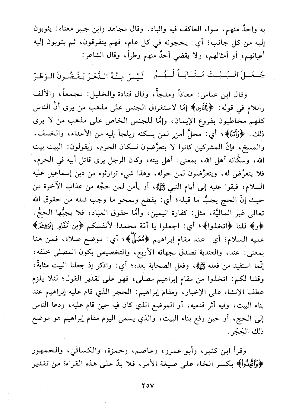 به واحدٌ منهم، سواء العاكف فيه والباد. وقال مجاهد وابن جبير معناه: يثوبون إليه من كل جانب؛ أي: يحجونه في كل عام، فهم يتفرقون، ثم يثوبون إليه أعيانهم، أو أمثالهم، ولا يقضي أحدٌ منهم وطرًا، وقال الشاعر: