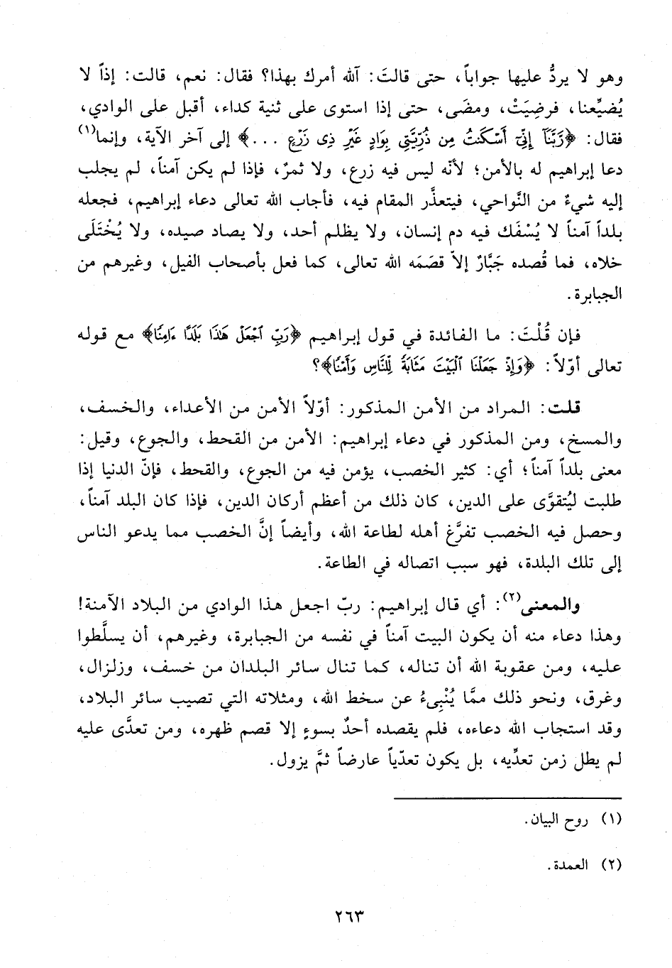 قلت: المراد من الأمن المذكور: أوّلًا الأمن من الأعداء، والخسف، والمسخ، ومن المذكور في دعاء إبراهيم: الأمن من القحط، والجوع، وقيل: معنى بلدًا آمنًا؛ أي: كثير الخصب، يؤمن فيه من الجوع، والقحط، فإن الدنيا إذا طلبت ليُتقوَّى على الدين، كان ذلك من أعظم أركان الدين، فإذا كان البلد آمنًا، وحصل فيه الخصب تفرَّغ أهله لطاعة الله، وأيضًا إنَّ الخصب مما يدعو الناس إلى تلك البلدة، فهو سبب اتصاله في الطاعة.