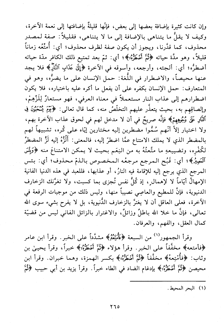 وإن كانت كثيرة بإضافة بعضها إلى بعض، فإنّها قليلةٌ بإضافتها إلى نعمة الآخرة، وكيف لا يقلُّ ما يتناهى بالإضافة إلى ما لا يتناهى، فقليلًا: صفة لمصدر محذوف، كما قدَّرنا، ويجوز أن يكون صفة لظرف محذوف؛ أي: أُمتِّعُه زمانًا قليلًا، وهو مدَّة حياته {ثُمَّ أَضْطَرُّهُ}؛ أي: ثمّ بعد تمتيع ذلك الكافر مدّة حياته أضطرُّه؛ أي: ألجئه، وأرجعه، وأسوقه في الآخرة {إِلَى عَذَابِ النَّارِ} فلا يجد عنها محيصًا، والاضطرار في اللُّغة: حمل الإنسان على ما يضرُّه، وهو في المتعارف: حمل الإنسان بكفره على أن يفعل ما أكره عليه باختياره، فلا يكون اضطرارهم إلى عذاب النار مستعملًا في معناه العرفي، فهو مستعارٌ لِلَزِّهِمْ، وإلصاقِهِم به، بحيث يتعذَّر عليهم التخلّصُ منه، كما قال تعالى: {يَوْمَ يُسْحَبُونَ فِي النَّارِ عَلَى وُجُوهِهِمْ} فإنَّه صريحٌ في أن لا مدخل لهم في لحوق عذاب الآخرة بهم، ولا اختيار إلّا أنّهم سُمُّوا مضطرين إليه مختارين إيّاه على كُره، تشبيهًا لهم بالمضطر الذي لا يملك الامتناع عمَّا اضطرّ إليه، فالمعنى: أَلُزُّهُ إليه لَزُّ المضطرِّ لكُفْرِه، وتضييعهِ ما متَّعتُهُ به من النِعَم بحيث لا يمكن الامتناعَ منه {وَبِئْسَ الْمَصِيرُ}؛ أي: قَبُح المرجع مرجعُه المخصوص بالذمّ محذوف؛ أي: بئس المرجع الذي يرجع إليه للإقامة فيه النارُ، أو عذابها، فللعبد في هذه الدنيا الفانية الإمهالُ أيّامًا لا لإهمالٍ، إذ كُلُّ نفس تُجزى بما كسبت، ولا تغرَّنك الزخارف الدنيوية، فإنَّ للمطيع والعاصِي نصيبًا منها، وليس ذلك من موجبات الرفعة في الآخرة، فعلى العاقل أن لا يغترَّ بالزخارف الدُّنيوية، بل لا يفرح بشيء سوى الله تعالى، فإنَّ ما خلا الله باطلٌ وزائلٌ، والاغترار بالزائل الفاني ليس من قضيّة كمال العقل، والفهم، والعرفان.