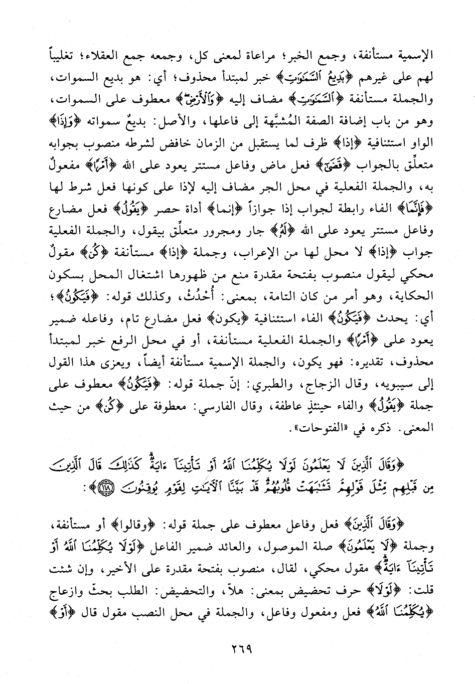 الإسمية مستأنفة، وجمع الخبر؛ مراعاة لمعنى كل، وجمعه جمع العقلاء؛ تغليبًا لهم على غيرهم {بَدِيعُ السَّمَاوَاتِ} خبر لمبتدأ محذوف؛ أي: هو بديع السموات، والجملة مستأنفة {السَّمَاوَاتِ} مضاف إليه {وَالْأَرْضِ} معطوف على السموات، وهو من باب إضافة الصفة المُشبَّهة إلى فاعلها، والأصل: بديعٌ سمواته {وَإِذَا} الواو استئنافية {إذا} ظرف لما يستقبل من الزمان خافض لشرطه منصوب بجوابه متعلِّق بالجواب {قَضَى} فعل ماض وفاعل مستتر يعود على الله {أَمْرًا} مفعولٌ به، والجملة الفعلية في محل البحر مضاف إليه لإذا على كونها فعل شرط لها {فَإِنَّمَا} الفاء رابطة لجواب إذا جوازًا {إنما} أداة حصر {يَقُولُ} فعل مضارع وفاعل مستتر يعود على الله {لَهُ} جار ومجرور متعلِّق بيقول، والجملة الفعلية جواب {إذا} لا محل لها من الإعراب، وجملة {إذا} مستأنفة {كن} مقولٌ محكي ليقول منصوب بفتحة مقدرة منع من ظهورها اشتغال المحل بسكون الحكاية، وهو أمر من كان التامة، بمعنى: أُحْدُثْ، وكذلك قوله: {فَيَكُونُ}؛ أي: يحدث {فَيَكُونُ} الفاء استئنافية {يكون} فعل مضارع تام، وفاعله ضمير يعود على {أَمْرًا} والجملة الفعلية مستأنفة، أو في محل الرفع خبر لمبتدأ محذوف، تقديره: فهو يكون، والجملة الإسمية مستأنفة أيضًا، ويعزى هذا القول إلى سيبويه، وقال الزجاج، والطبري: إنّ جملة قوله: {فَيَكُونُ} معطوف على جملة {يَقُولُ} والفاء حينئذٍ عاطفة، وقال الفارسي: معطوفة على {كُنْ} من حيث المعنى. ذكره في "الفتوحات".