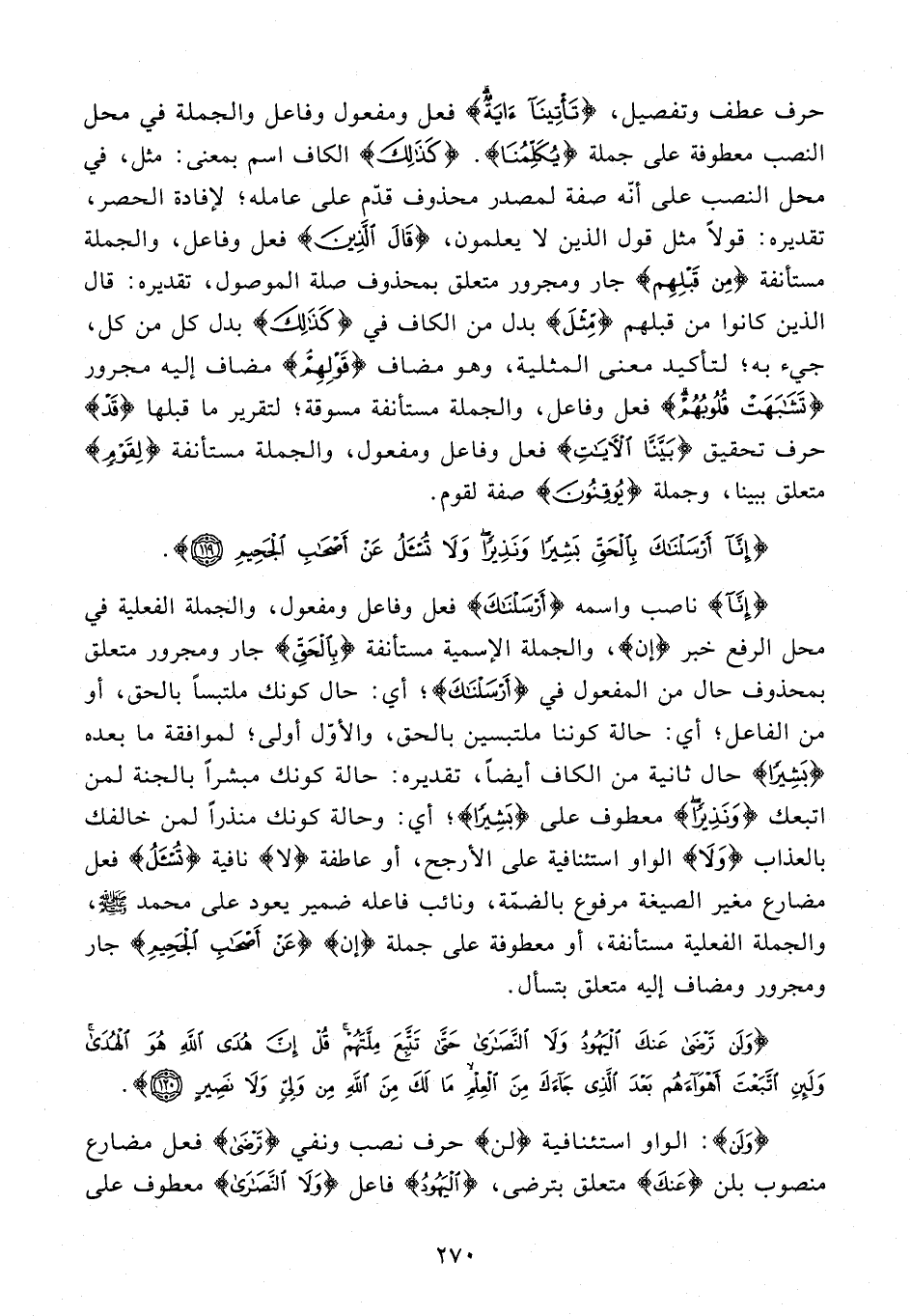 {إِنَّا} ناصب واسمه {أَرْسَلْنَاكَ} فعل وفاعل ومفعول، والجملة الفعلية في محل الرفع خبر {إن}، والجملة الإسمية مستأنفة {بِالْحَقِّ} جار ومجرور متعلق بمحذوف حال من المفعول في {أَرْسَلْنَاكَ}؛ أي: حال كونك ملتبسًا بالحق، أو من الفاعل؛ أي: حالة كوننا ملتبسين بالحق، والأوّل أولى؛ لموافقة ما بعده {بَشِيرًا} حال ثانية من الكاف أيضًا، تقديره: حالة كونك مبشرًا بالجنة لمن اتبعك {وَنَذِيرًا} معطوف على {بَشِيرًا}؛ أي: وحالة كونك منذرًا لمن خالفك بالعذاب {وَلَا} الواو استئنافية على الأرجح، أو عاطفة {لَا} نافية {تُسْأَلُ} فعل مضارع مغير الصيغة مرفوع بالضمّة، ونائب فاعله ضمير يعود على محمد - صلى الله عليه وسلم -، والجملة الفعلية مستأنفة، أو معطوفة على جملة {إن} {عَنْ أَصْحَابِ الْجَحِيمِ} جار ومجرور ومضاف إليه متعلق بتسأل.