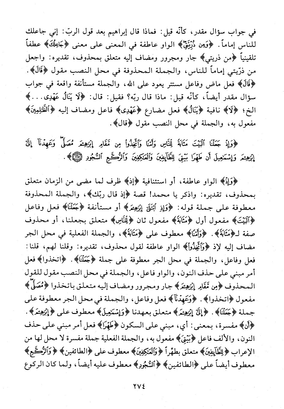 {وَإِذْ} الواو عاطفة، أو استئنافية {إذ} ظرف لما مضى من الزمان متعلق بمحذوف، تقديره: واذكر يا محمد! قصة {إذ قال ربّك}، والجملة المحذوفة معطوفة على جملة قوله: {وَإِذِ ابْتَلَى إِبْرَاهِيمَ} أو مستأنفة {جَعَلْنَا} فعل وفاعل {الْبَيْتَ} مفعول أول {مَثَابَةً} مفعول ثان {لِلنَّاسِ} متعلق بجعلنا، أو محذوف صفة لـ {مَثَابَةً}. {وَأَمْنًا} معطوف على {مَثَابَةً}، والجملة الفعلية في محل الجر مضاف إليه لإذ {وَاتَّخِذُوا} الواو عاطفة لقول محذوف، تقديره: وقلنا لهم، قلنا: فعل وفاعل، والجملة في محل البحر معطوفة على جملة {جَعَلْنَا}. {اتخذوا} فعل أمر مبني على حذف النون، والواو فاعل، والجملة في محل النصب مقول للقول المحذوف {مِنْ مَقَامِ إِبْرَاهِيمَ} جار ومجرور ومضاف إليه متعلق باتخذوا {مُصَلًّى} مفعول {اتخذوا}. {وَعَهِدْنَا} فعل وفاعل، والجملة في محل الجر معطوفة على جملة {جَعَلْنَا}. {إِلَى إِبْرَاهِيمَ} متعلق بعهدنا {وَإِسْمَاعِيلَ} معطوف على {إِبْرَاهِيمَ}. {أَن} مفسرة، بمعنى: أي، مبني على السكون {طَهِّرَا} فعل أمر مبني على حذف النون، والألف فاعل {بَيتِيَ} مفعول به، والجملة الفعلية جملة مفسرة لا محل لها من الإعراب {لِلطَّائِفِينَ} متعلق بطهِّرًا {وَالْعَاكِفِينَ} معطوف على {الطائفين} {وَالرُّكَّعِ} معطوف أيضًا على {الطائفين} {السُّجُودِ} معطوف عليه أيضًا، ولما كان الركوع