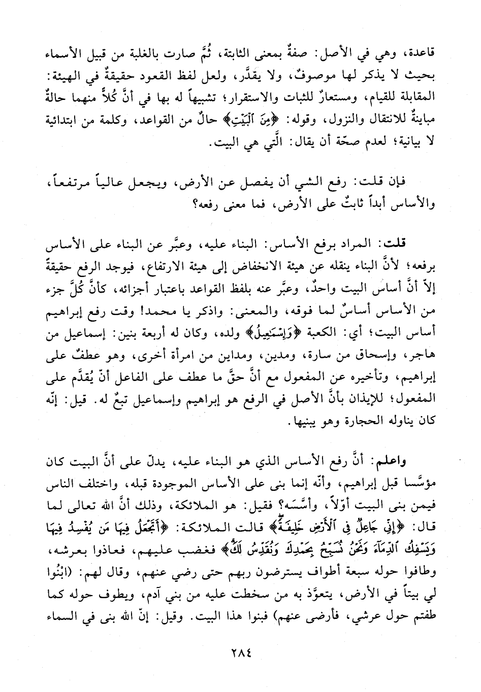 واعلم: أنَّ رفع الأساس الذي هو البناء عليه، يدلّ على أنَّ البيت كان مؤسَّسا قبل إبراهيم، وأنّه إنما بنى على الأساس الموجودة قبله، واختلف الناس فيمن بنى البيت أوّلًا، وأسَّسَه؟ فقيل: هو الملائكة، وذلك أنَّ الله تعالى لما قال: {إِنِّي جَاعِلٌ فِي الْأَرْضِ خَلِيفَةً} قالت الملائكة: {أَتَجْعَلُ فِيهَا مَنْ يُفْسِدُ فِيهَا وَيَسْفِكُ الدِّمَاءَ وَنَحْنُ نُسَبِّحُ بِحَمْدِكَ وَنُقَدِّسُ لَكَ} فغضب عليهم، فعاذوا بعرشه، وطافوا حوله سبعة أطواف يسترضون ربهم حتى رضي عنهم، وقال لهم: (ابْنُوا لي بيتًا في الأرض، يتعوَّذ به من سخطت عليه من بني آدم، ويطوف حوله كما طفتم حول عرشي، فأرضى عنهم) فبنوا هذا البيت. وقيل: إنّ الله بنى في السماء