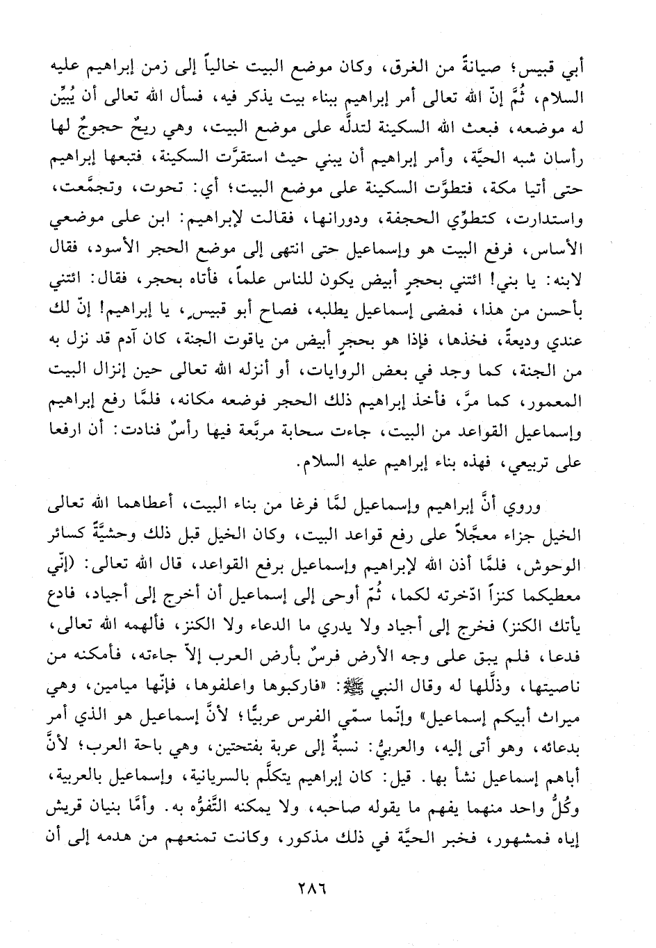 وروي أنَّ إبراهيم وإسماعيل لمَّا فرغا من بناء البيت، أعطاهما الله تعالى الخيل جزاء معجَّلًا على رفع قواعد البيت، وكان الخيل قبل ذلك وحشيَّةً كسائر الوحوش، فلمَّا أذن الله لإبراهيم وإسماعيل برفع القواعد، قال الله تعالى: (إنّي معطيكما كنزًا ادّخرته لكما، ثُمّ أوحى إلى إسماعيل أن اخرج إلى أجياد، فادع يأتك الكنز) فخرج إلى أجياد ولا يدري ما الدعاء ولا الكنز، فألهمه الله تعالى، فدعا، فلم يبق على وجه الأرض فرسٌ بأرض العرب إلّا جاءته، فأمكنه من ناصيتها، وذلَّلها له وقال النبي - صلى الله عليه وسلم -: "فاركبوها واعلفوها، فإنّها ميامين، وهي ميراث أبيكم إسماعيل" وإنّما سمّي الفرس عربيًّا؛ لأنَّ إسماعيل هو الذي أمر بدعائه، وهو أتى إليه، والعربيُّ: نسبةٌ إلى عربة بفتحتين، وهي باحة العرب؛ لأنَّ أباهم إسماعيل نشأ بها. قيل: كان إبراهيم يتكلَّم بالسريانية، وإسماعيل بالعربية، وكُلُّ واحد منهما يفهم ما يقوله صاحبه، ولا يمكنه التَّفوُّه به. وأمَّا بنيان قريش إياه فمشهور، فخبر الحيَّة في ذلك مذكور، وكانت تمنعهم من هدمه إلى أن