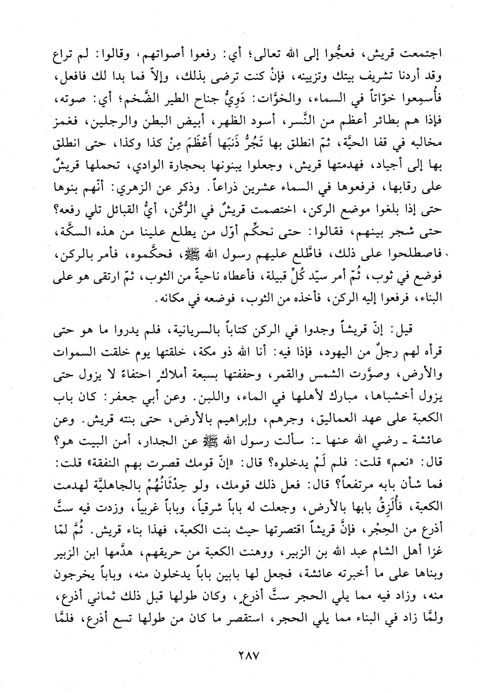 قيل: إنّ قريشًا وجدوا في الركن كتابًا بالسريانية، فلم يدروا ما هو حتى قرأه لهم رجلٌ من اليهود، فإذا فيه: أنا الله ذو مكة، خلقتها يوم خلقت السموات والأرض، وصوَّرت الشمس والقمر، وحففتها بسبعة أملاكٍ احتفاءً لا يزول حتى يزول أخشباها، مبارك لأهلها في الماء، واللبن. وعن أبي جعفر: كان باب الكعبة على عهد العماليق، وجرهم، وإبراهيم بالأرض، حتى بنته قريش. وعن عائشة - رضي الله عنها -: سألت رسول الله - صلى الله عليه وسلم - عن الجدار، أمن البيت هو؟ قال: "نعم" قلت: فلم لَمْ يدخلوه؟ قال: "إنّ قومك قصرت بهم النفقة" قلت: فما شأن بابه مرتفعًا؟ قال: فعل ذلك قومك، ولو حِدْثَانُهُمْ بالجاهليَّة لهدمت الكعبة، فأُلَزِقُ بابها بالأرض، وجعلت له بابًا شرقيًّا، وبابًا غربيًّا، وزدت فيه ستَّ أذرع من الحِجْر، فإنَّ قريشًا اقتصرتها حيث بنت الكعبة، فهذا بناء قريش. ثُمَّ لمّا غزا أهل الشام عبد الله بن الزبير، ووهنت الكعبة من حريقهم، هدَّمها ابن الزبير وبناها على ما أخبرته عائشة، فجعل لها بابين بابًا يدخلون منه، وبابًا يخرجون منه، وزاد فيه مما يلي الحجر ستَّ أذرعٍ، وكان طولها قبل ذلك ثماني أذرع، ولمَّا زاد في البناء مما يلي الحجر، استقصر ما كان من طولها تسع أذرع، فلمَّا