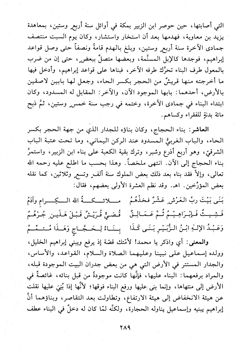 العاشر: بناء الحجاج، وكان بناؤه للجدار الذي من جهة الحجر بكسر الحاء، والباب الغربيُّ المسدود عند الركن اليماني، وما تحت عتبة الباب الشرقيّ، وهو أربع أذرع وشبر، وترك بقية الكعبة على بناء ابن الزبير، واستمرَّ بناء الحجاج إلى الآن. انتهى ملخصًا. وهذا بحسب ما اطلع عليه رحمه الله تعالى، وإلّا فقد بناه بعد ذلك بعض الملوك سنة ألفٍ وتسعٍ وثلاثين، كما نقله بعض المؤرِّخين. اهـ. وقد نظم العشرة الأولى بعضهم، فقال: