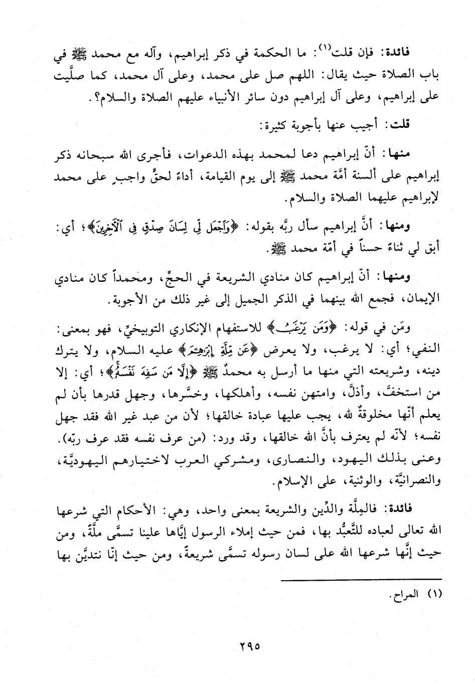 ومنها: أنّ إبراهيم كان منادي الشريعة في الحجِّ، ومحمدًا كان منادي الإيمان، فجمع الله بينهما في الذكر الجميل إلى غير ذلك من الأجوبة.