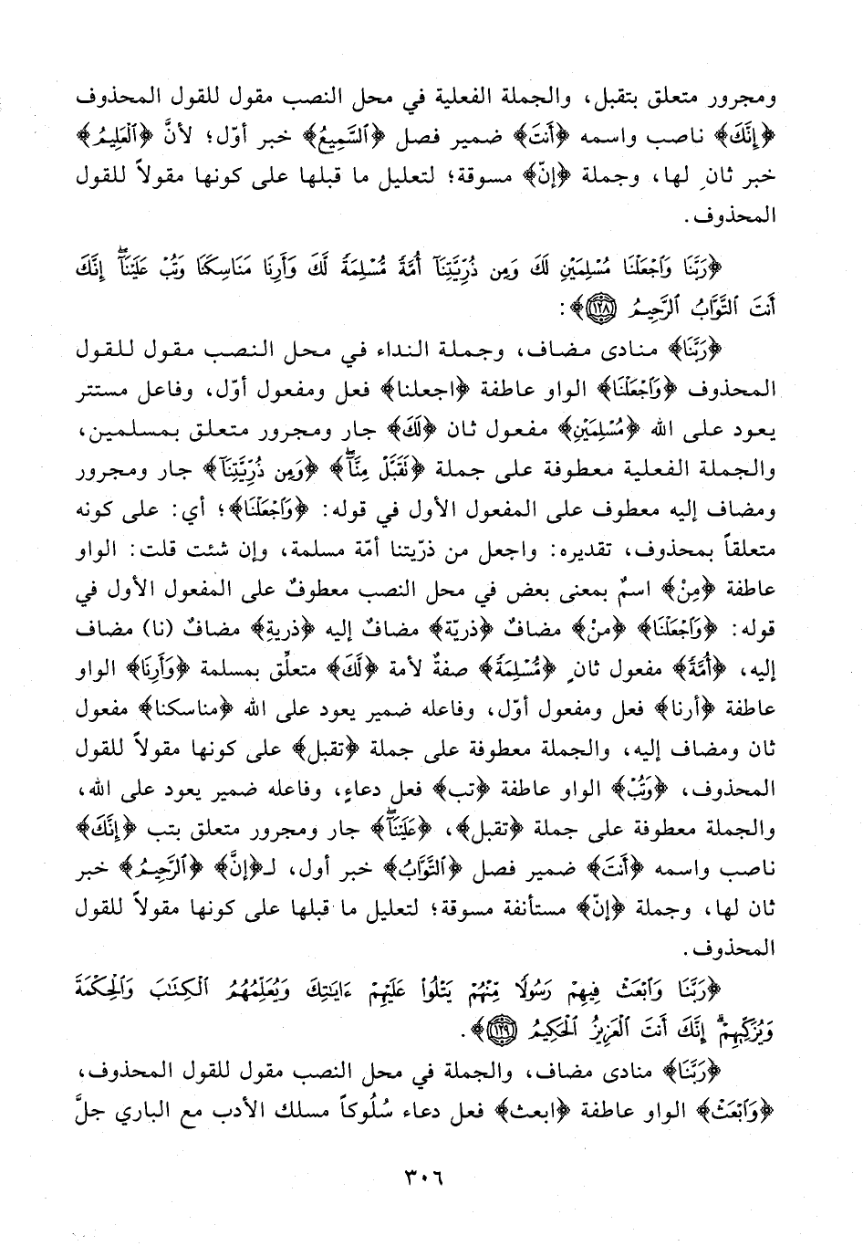 {رَبَّنَا} منادى مضاف، وجملة النداء في محل النصب مقول للقول المحذوف {وَاجْعَلْنَا} الواو عاطفة {اجعلنا} فعل ومفعول أوّل، وفاعل مستتر يعود على الله {مُسْلِمَيْنِ} مفعول ثان {لَكَ} جار ومجرور متعلق بمسلمين، والجملة الفعلية معطوفة على جملة {تَقَبَّلْ مِنَّا} {وَمِنْ ذُرِّيَّتِنَا} جار ومجرور ومضاف إليه معطوف على المفعول الأول في قوله: {وَاجْعَلْنَا}؛ أي: على كونه متعلقًا بمحذوف، تقديره: واجعل من ذرّيتنا أمّة مسلمة، وإن شئت قلت: الواو عاطفة {مِنْ} اسمٌ بمعنى بعض في محل النصب معطوفٌ على المفعول الأول في قوله: {وَاجْعَلْنَا} {منْ} مضافٌ {ذريّة} مضافٌ إليه {ذرية} مضافٌ (نا) مضاف إليه، {أُمَّةً} مفعول ثانٍ {مُسْلِمَةً} صفةٌ لأمة {لَكَ} متعلِّق بمسلمة {وَأَرِنَا} الواو عاطفة {أرنا} فعل ومفعول أوّل، وفاعله ضمير يعود على الله {مناسكنا} مفعول ثان ومضاف إليه، والجملة معطوفة على جملة {تقبل} على كونها مقولًا للقول المحذوف، {وَتُبْ} الواو عاطفة {تب} فعل دعاءٍ، وفاعله ضمير يعود على الله، والجملة معطوفة على جملة {تقبل}، {عَلَيْنَا} جار ومجرور متعلق بتب {إِنَّكَ} ناصب واسمه {أَنتَ} ضمير فصل {التَّوَّابُ} خبر أول، لـ {إنَّ} {الرَّحِيمُ} خبر ثان لها، وجملة {إنّ} مستأنفة مسوقة؛ لتعليل ما قبلها على كونها مقولًا للقول المحذوف.
