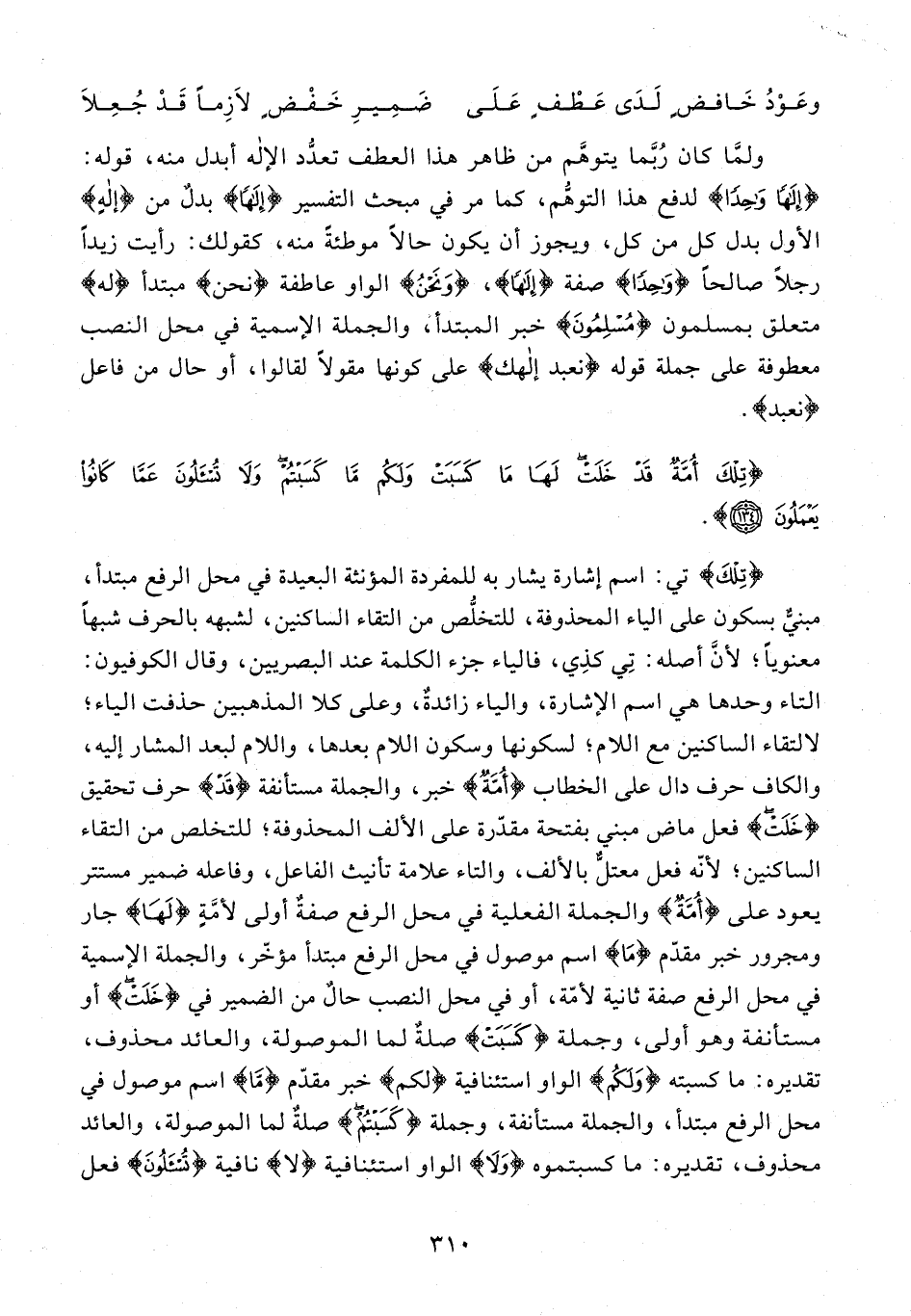 {تِلْكَ} تي: اسم إشارة يشار به للمفردة المؤنثة البعيدة في محل الرفع مبتدأ، مبنيٌّ بسكون على الياء المحذوفة، للتخلُّص من التقاء الساكنين، لشبهه بالحرف شبهًا معنويًّا؛ لأنَّ أصله: تِي كذِي، فالياء جزء الكلمة عند البصريين، وقال الكوفيون: التاء وحدها هي اسم الإشارة، والياء زائدةٌ، وعلى كلا المذهبين حذفت الياء؛ لالتقاء الساكنين مع اللام؛ لسكونها وسكون اللام بعدها، واللام لبعد المشار إليه، والكاف حرف قال على الخطاب {أُمَّةٌ} خبر، والجملة مستأنفة {قَدْ} حرف تحقيق {خَلَتْ} فعل ماض مبني بفتحة مقدّرة على الألف المحذوفة؛ للتخلص من التقاء الساكنين؛ لأنّه فعل معتلٌّ بالألف، والتاء علامة تأنيث الفاعل، وفاعله ضمير مستتر يعود على {أُمَّةٌ} والجملة الفعلية في محل الرفع صفةٌ أولى لأمَّةٍ {لَهَا} جار ومجرور خبر مقدّم {مَا} اسم موصول في محل الرفع مبتدأ مؤخّر، والجملة الإسمية في محل الرفع صفة ثانية لأمّة، أو في محل النصب حالٌ من الضمير في {خَلَتْ} أو مستأنفة وهو أولى، وجملة {كَسَبَتْ} صلةٌ لما الموصولة، والعائد محذوف، تقديره: ما كسبته {وَلَكُمْ} الواو استئنافية {لكم} خبر مقدّم {مَا} اسم موصول في محل الرفع مبتدأ، والجملة مستأنفة، وجملة {كَسَبْتُمْ} صلةٌ لما الموصولة، والعائد محذوف، تقديره: ما كسبتموه {وَلَا} الواو استئنافية {لَا} نافية {تُسْأَلُونَ} فعل