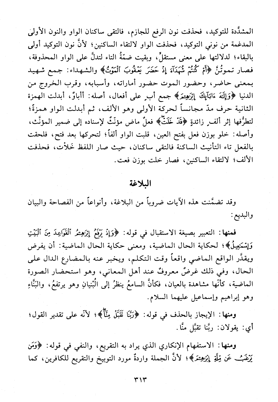 وقد تضمَّنت هذه الآيات ضروبًا من البلاغة، وأنواعًا من الفصاحة والبيان والبديع: فمنها: التعبير بصيغة الاستقبال في قوله: {وَإِذْ يَرْفَعُ إِبْرَاهِيمُ الْقَوَاعِدَ مِنَ الْبَيْتِ وَإِسْمَاعِيلُ}؛ لحكاية الحال الماضية، ومعنى حكاية الحال الماضية: أن يفرض ويقدَّر الواقع الماضي واقعًا وقت التكلم، ويخبر عنه بالمضارع الدال على الحال، وفي ذلك غرضٌ معروفٌ عند أهل المعاني، وهو استحضار الصورة الماضية، كأنّها مشاهدة بالعيان، فكأنَّ السامعُ ينظرُ إلى البُنْيانِ وهو يرتفعُ، والبَنَّاءِ وهو إبراهيم وإسماعيل عليهما السلام.