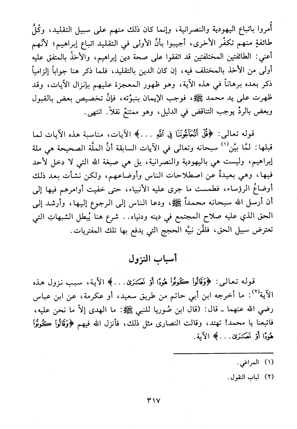قوله تعالى: {وَقَالُوا كُونُوا هُودًا أَوْ نَصَارَى ...} الآية، سبب نزول هذه الآية (¬2): ما أخرجه ابن أبي حاتم من طريق سعيد، أو عكرمة، عن ابن عباس رضي الله عنهما - قال: (قال ابن صُوريا للنبي - صلى الله عليه وسلم -: ما الهدى إلّا ما نحن عليه، فاتبعنا يا محمد! تهتد، وقالت النصارى مثل ذلك، فأنزل الله فيهم {وَقَالُوا كُونُوا هُودًا أَوْ نَصَارَى ...} الآية.