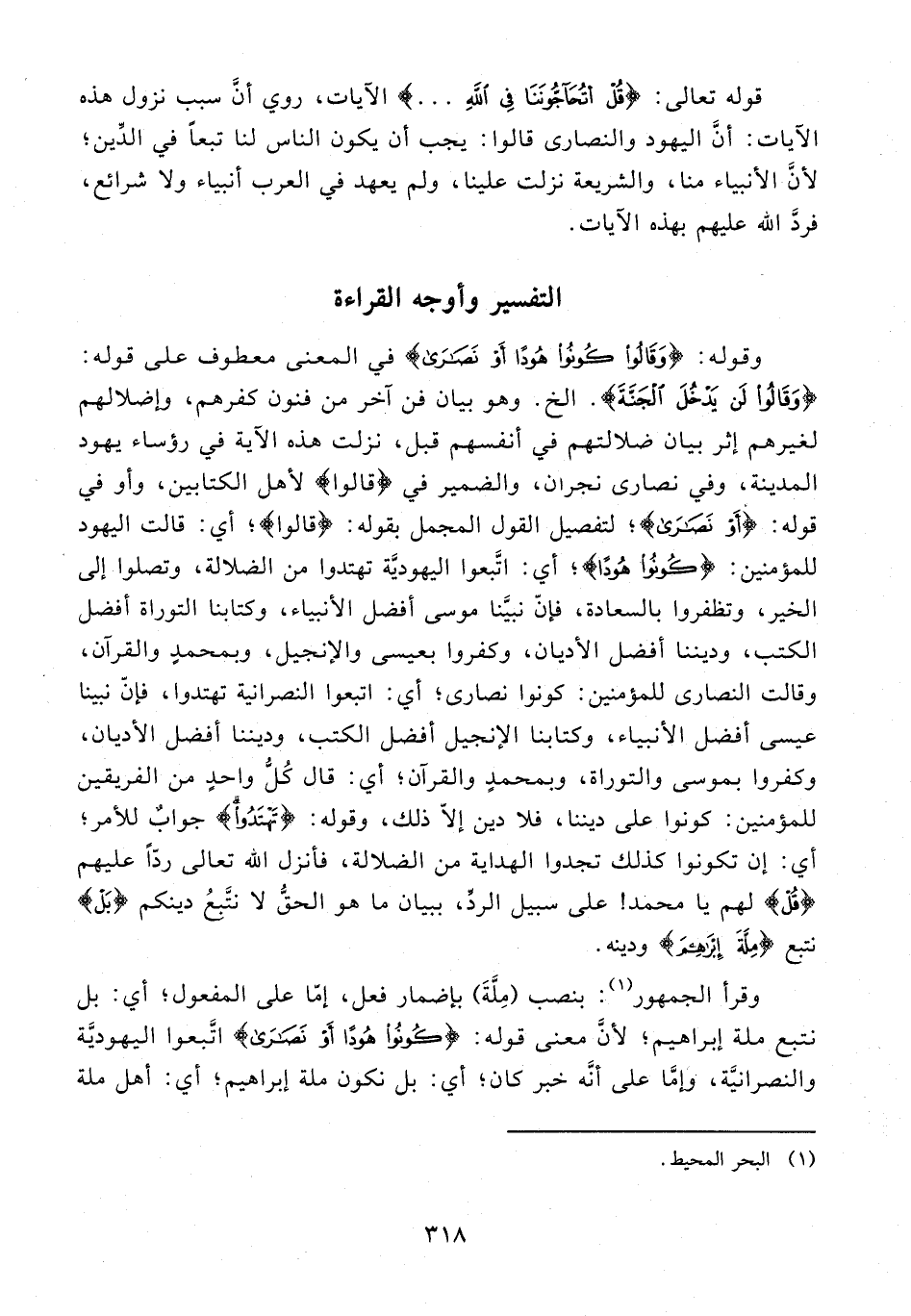 135 - وقوله: {وَقَالُوا كُونُوا هُودًا أَوْ نَصَارَى} في المعنى معطوف على قوله: {وَقَالُوا لَنْ يَدْخُلَ الْجَنَّةَ}. الخ. وهو بيان فن آخر من فنون كفرهم، وإضلالهم لغيرهم إثر بيان ضلالتهم في أنفسهم قبل، نزلت هذه الآية في رؤساء يهود المدينة، وفي نصارى نجران، والضمير في {قالوا} لأهل الكتابين، وأو في قوله: {أَوْ نَصَارَى}؛ لتفصيل القول المجمل بقوله: {قالوا}؛ أي: قالت اليهود للمؤمنين: {كُونُوا هُودًا}؛ أي: اتَّبعوا اليهوديَّة تهتدوا من الضلالة، وتصلوا إلى الخير، وتظفروا بالسعادة، فإنّ نبيَّنا موسى أفضل الأنبياء، وكتابنا التوراة أفضل الكتب، وديننا أفضل الأديان، وكفروا بعيسى والإنجيل، وبمحمدٍ والقرآن، وقالت النصارى للمؤمنين: كونوا نصارى؛ أي: اتبعوا النصرانية تهتدوا، فإنّ نبينا عيسى أفضل الأنبياء، وكتابنا الإنجيل أفضل الكتب، وديننا أفضل الأديان، وكفروا بموسى والتوراة، وبمحمدٍ والقرآن؛ أي: قال كُلُّ واحدٍ من الفريقين للمؤمنين: كونوا على ديننا، فلا دين إلّا ذلك، وقوله: {تَهْتَدُوا} جوابٌ للأمر؛ أي: إن تكونوا كذلك تجدوا الهداية من الضلالة، فأنزل الله تعالى ردًّا عليهم {قُلْ} لهم يا محمد! على سبيل الردِّ، ببيان ما هو الحقُّ لا نتَّبعُ دينكم {بَلْ} نتبع {مِلَّةَ إِبْرَاهِيمَ} ودينه.